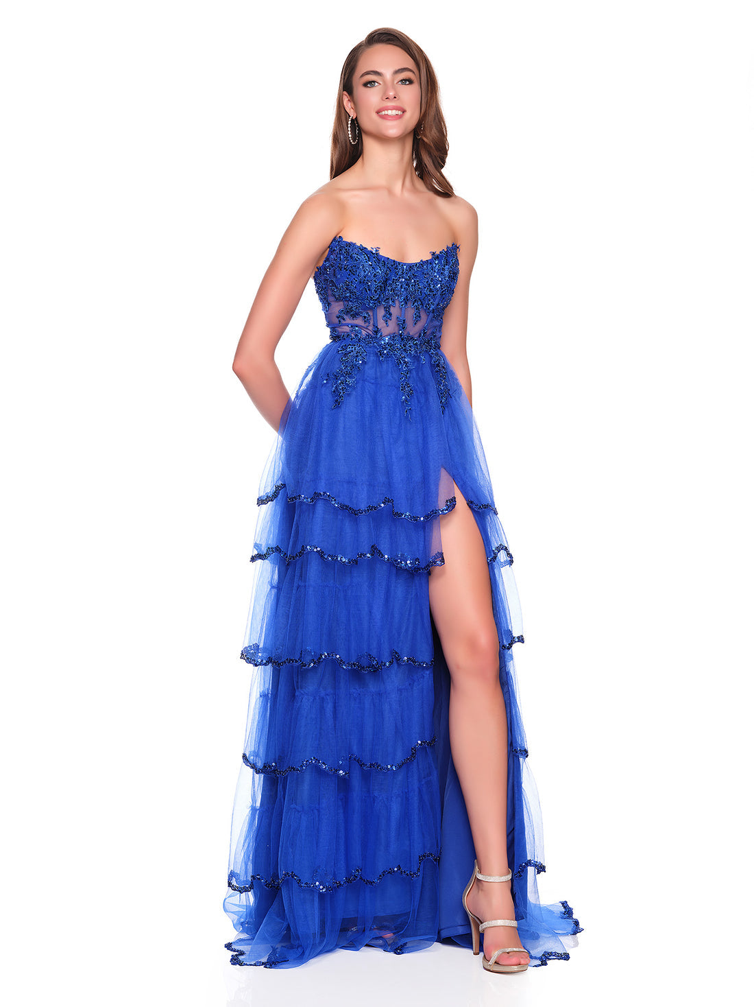 Vibrant artistry defines Dave & Johnny 12871, balancing a structured bodice with a playful tiered skirt. The strapless scoop neckline reveals an embellished corset top that sculpts the figure while catching the light in intricate patterns. A flowing A-line skirt cascades in layered tiers, each finished with subtle sparkle for dimension. The thigh-high slit adds a refined edge, completing a look both spirited and polished. Perfect for statement occasions, Dave & Johnny 12871 radiates personality and structured charm. Model is wearing Royal color.
