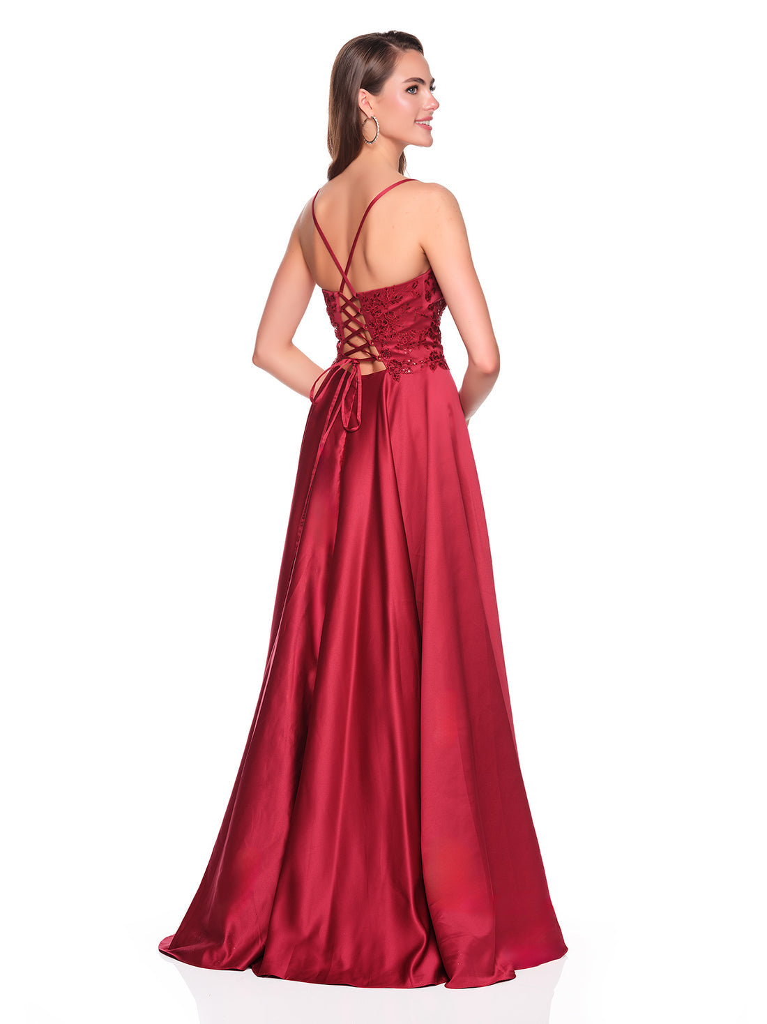 Distinct presence shines through Dave & Johnny 12873, where structured detail meets voluminous flow. Spaghetti straps support a deep v-neckline, leading to an intricately adorned bodice that shapes the waist with dimension and texture. The full A-line skirt cascades outward in controlled volume, emphasizing balance and proportion. Every embellishment contributes to visual depth, reflecting precision in structure. Elegant yet expressive, Dave & Johnny 12873 transforms formalwear into artful sophistication that captivates from every view. Model is wearing Wine color.