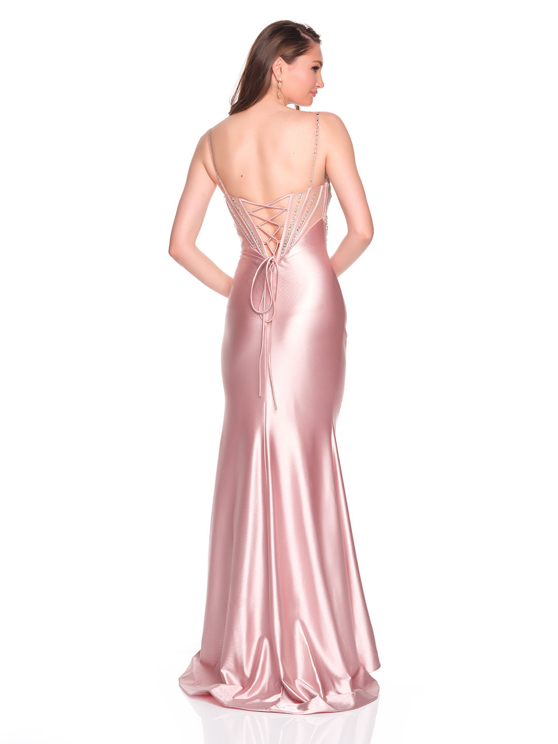 Alluring shimmer and structured artistry define Dave & Johnny 12899, offering a captivating silhouette. The deep v-neckline complements the illusion corset bodice adorned with crystal beadwork that glimmers with movement. Gentle ruching highlights the waistline, creating a soft and sculpted effect that enhances the figure. A side slit adds height and flow to the sheath skirt, balanced by delicate spaghetti straps. Every beaded accent contributes to a luminous finish, making Dave & Johnny 12899 an elegant statement piece for special occasions. Model is wearing Pink color.