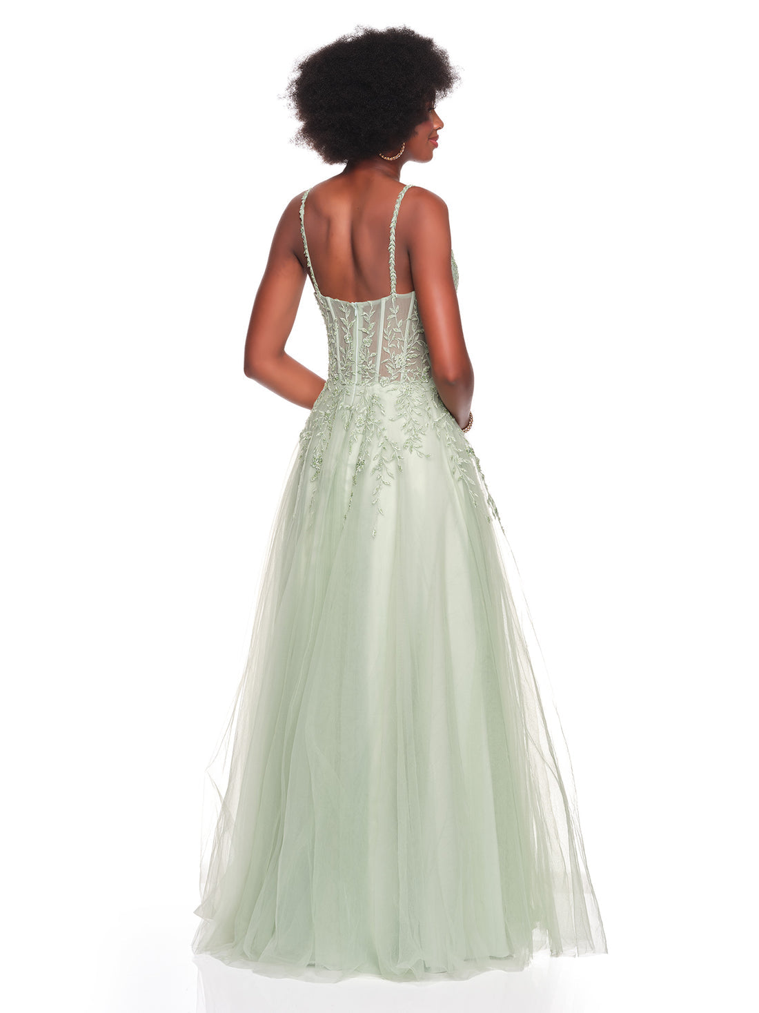 Whimsical charm flows through Dave & Johnny 12907, a ballgown that merges structured detail with delicate artistry. The corset bodice highlights a scoop neckline framed by thin straps and a midrise zippered back that offers a tailored fit. Foliage embroidery cascade along the bodice, softening into a layered skirt that moves with air-light ease. Every petal accent adds a touch of dimension, making Dave & Johnny 12907 a graceful selection for formal evenings and celebrations. Model is wearing Sage color.