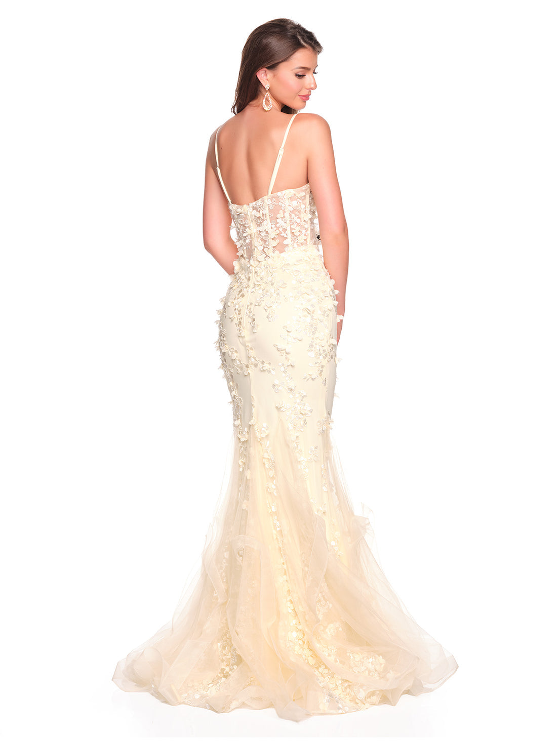 Floral artistry blooms beautifully in Dave & Johnny 12912, where sculpted detail meets a captivating silhouette. The deep v-neckline is enhanced by adjustable thin straps that accentuate the shoulders, while dimensional floral appliques trail over the fitted bodice and down the hips. The mermaid skirt cascades gracefully into a layered hem that moves fluidly with each step. The open back adds a soft allure, creating an exquisite finish that makes Dave & Johnny 12912 ideal for pageants, galas, or grand celebrations. Model is wearing Lt Yellow color.