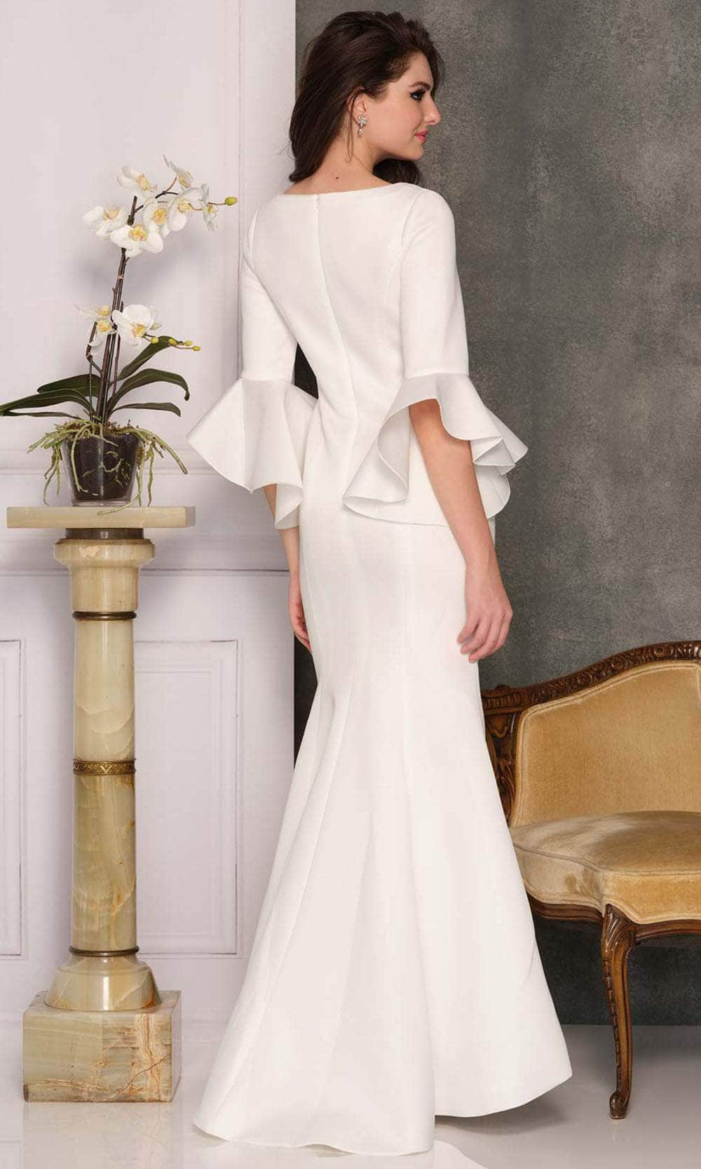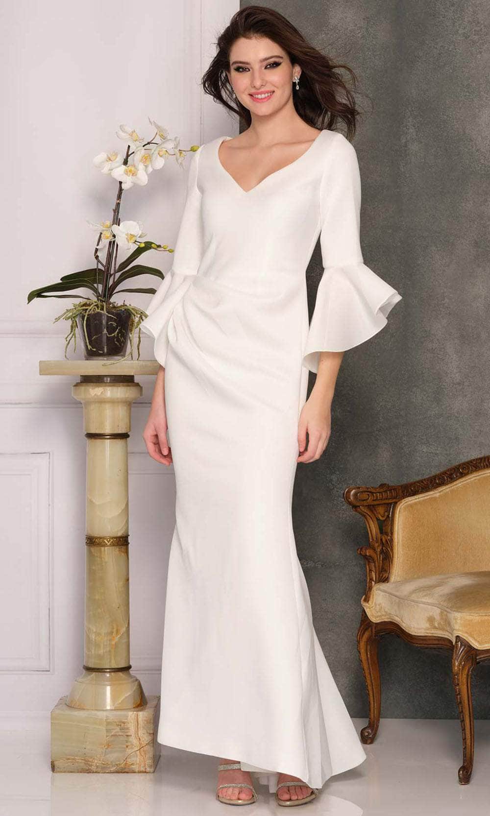 Step out in a gorgeous dress from Dave & Johnny A10354. This sophisticated piece features a sweetheart neckline and a long bell sleeve. The long skirt is designed with a partially side pleats and fits and flares into a trumpet shape before ending in a full-length hem with a sweep train finish at the back. Look fantastic in photos with this Dave & Johnny dress. Well known for intricate fabric and exquisite pattern work, Dave & Johnny dresses are sure to be a heavy draw at this years prom, or more likely that key occasion where only the most beautiful long or short gown makes the cut. Models are wearing Burgundy and Ivory colors.