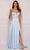 Glow with the utter elegance of a siren in this Dave & Johnny A10437. Dainty spaghetti straps that extend to the back for a lace-up style result is beautiful. Plunging V-neckline sitting at the empire waist reveals a flowy A-line silhouette with front side leg slit and a sweep train finish. Swoon over the lavish style bestowed by this Dave & Johnny masterpiece! Well known for intricate fabric and exquisite pattern work, Dave & Johnny dresses are sure to be a heavy draw at this years prom, or more likely that key occasion where only the most beautiful long or short gown makes the cut. Modes are wearing the Ice Blue, Lilac and Coral Oranges variants of the dress.