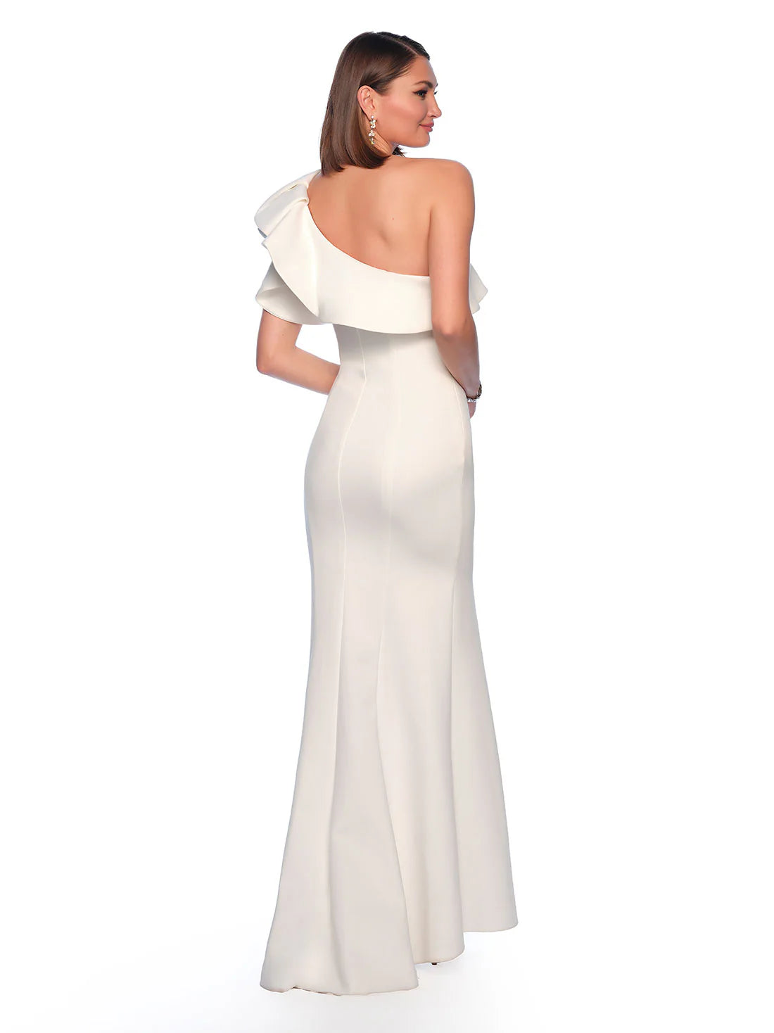 Details: Ruffled Neckline, Fit and Flare, One Shoulder Strap, Back Zipper, Train, Slit
