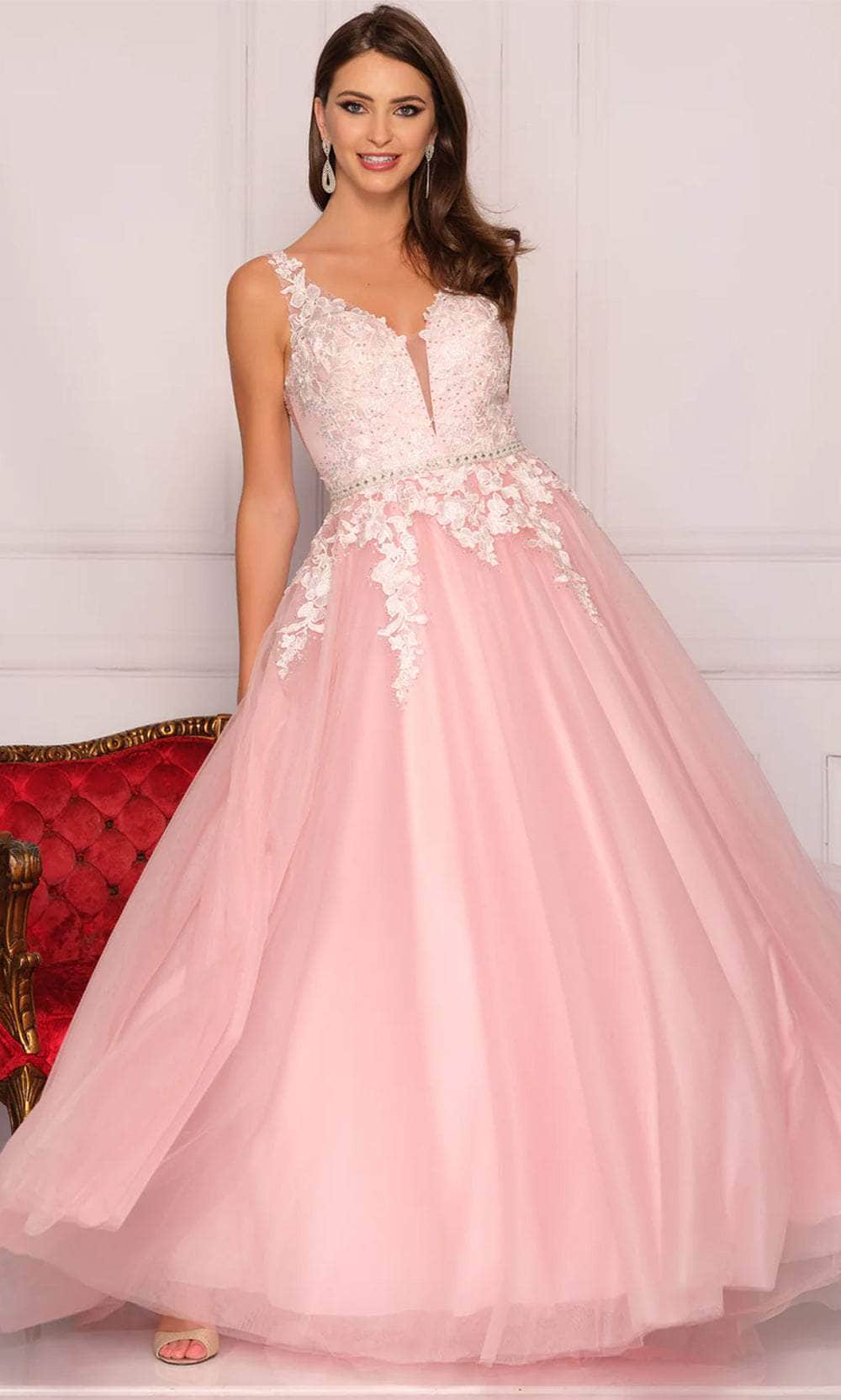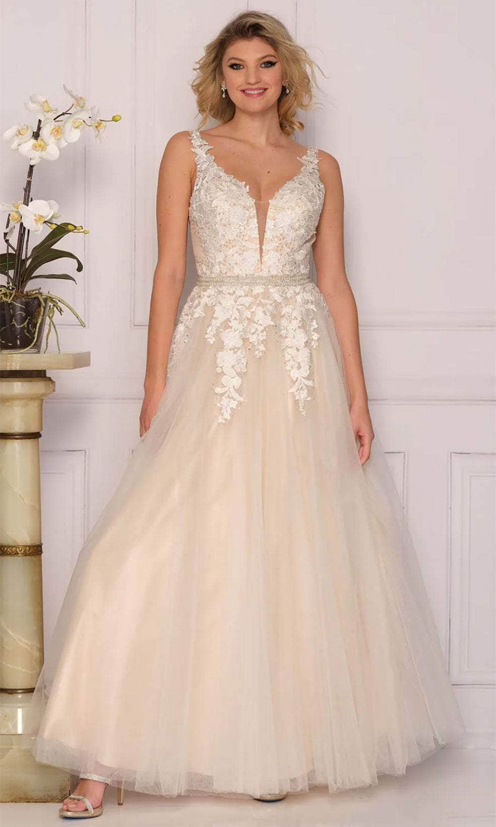 Embark on your fairytale wedding in the Dave & Johnny Bridal 10246W masterpiece. This wedding gown sculpts your form with meticulous tailoring, ensuring a flawless silhouette that flatters your every curve. The sleeveless bodice is adorned with cascading rhinestones and delicate lace appliques, a testament to exquisite craftsmanship. An illusion inset adds a touch of modern allure, while the embellished waistband cinches your figure for a touch of timeless elegance. The deep V-open back offers a hint of sophisticated sensuality, and the layered tulle skirt with a floor-length hem cascades into a cloud of ethereal beauty. Ideal for your grand entrance on your wedding day, this Dave & Johnny Bridal 10246W creation guarantees you'll be a vision of breathtaking elegance and unforgettable memories in your wake. Models are wearing the Ivory, Black, Mint, and Pink colors.