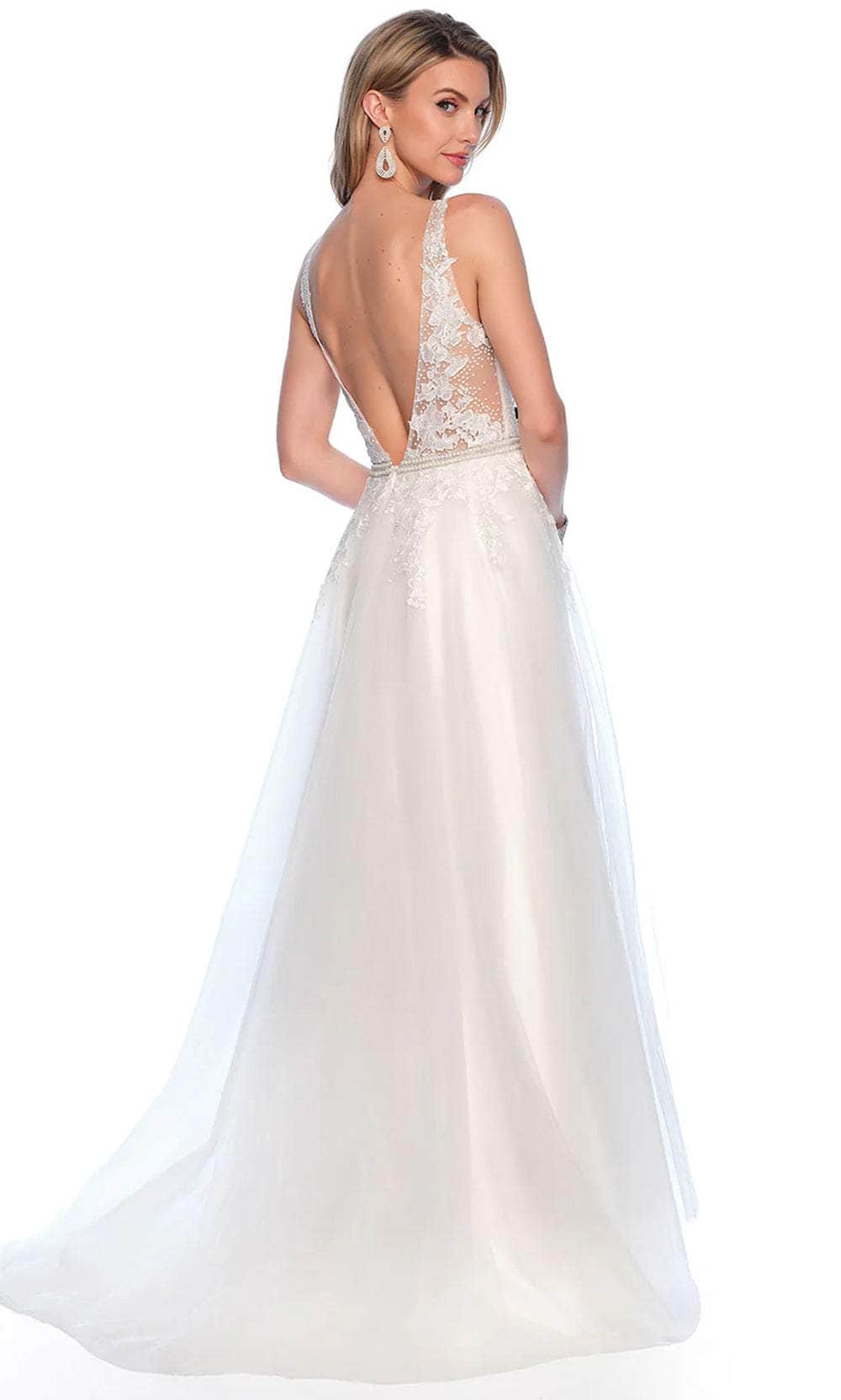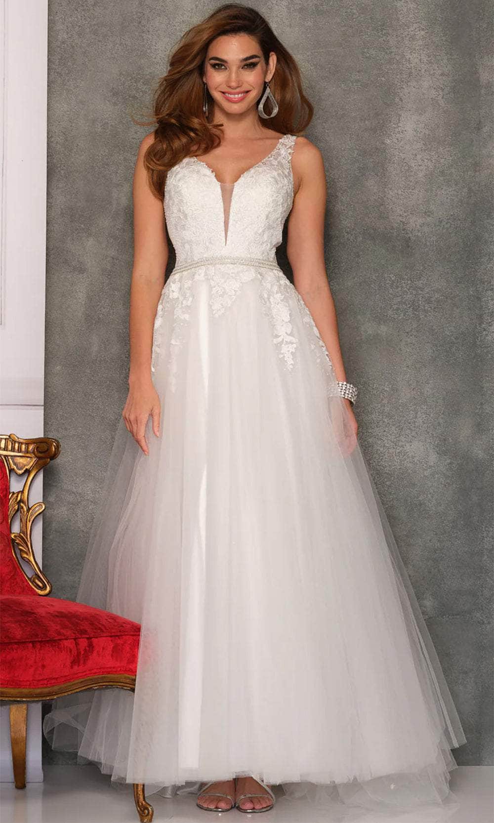 Lavish in the gorgeous appeal of wearing the Dave & Johnny Bridal 10765W gown on your wedding day. Crafted from delicate tulle, this dress sculpts the feminine form with meticulous precision. The sleeveless silhouette highlights the plunging V-neckline with an illusion inset, adding a hint of alluring mystery. Exquisite floral appliqués and a beaded waistband enhance the bodice, drawing attention to the waistline. The plunging V-open back provides a touch of daring sophistication, while the layered A-line skirt flows into a graceful sweep train, ensuring a dramatic entrance. The Dave & Johnny Bridal 10765W gown epitomizes romantic opulence, perfect for the bride seeking ethereal beauty on her wedding day. Model is wearing the White color.