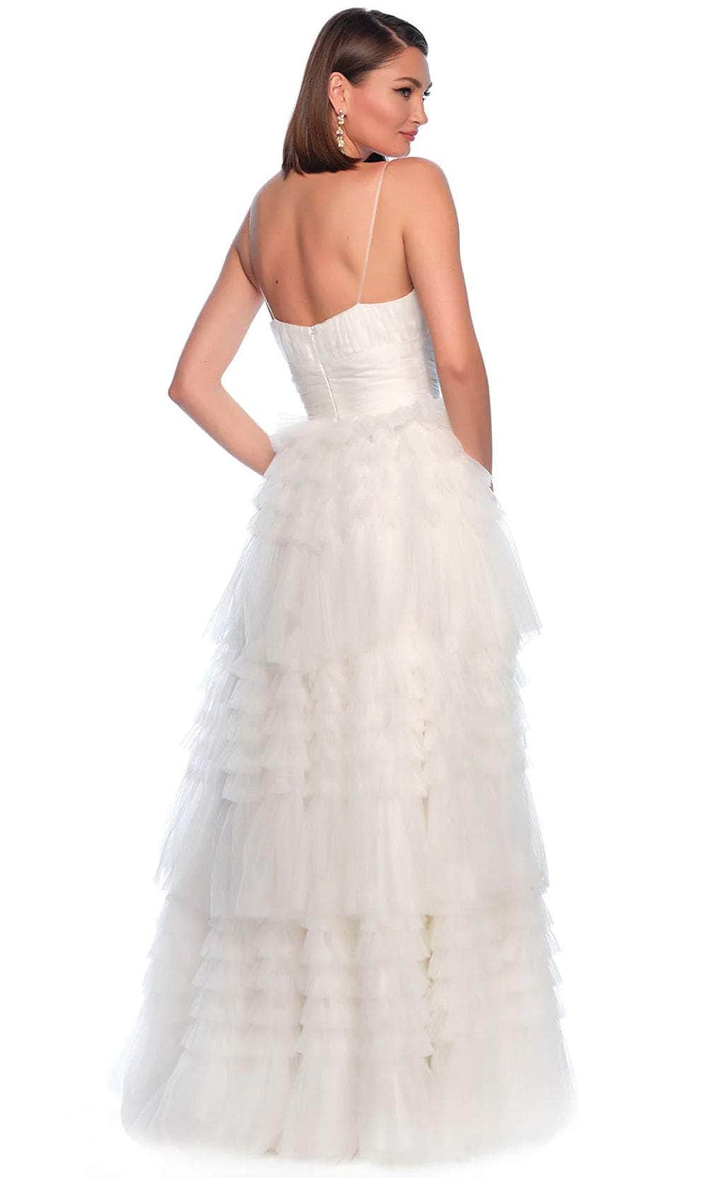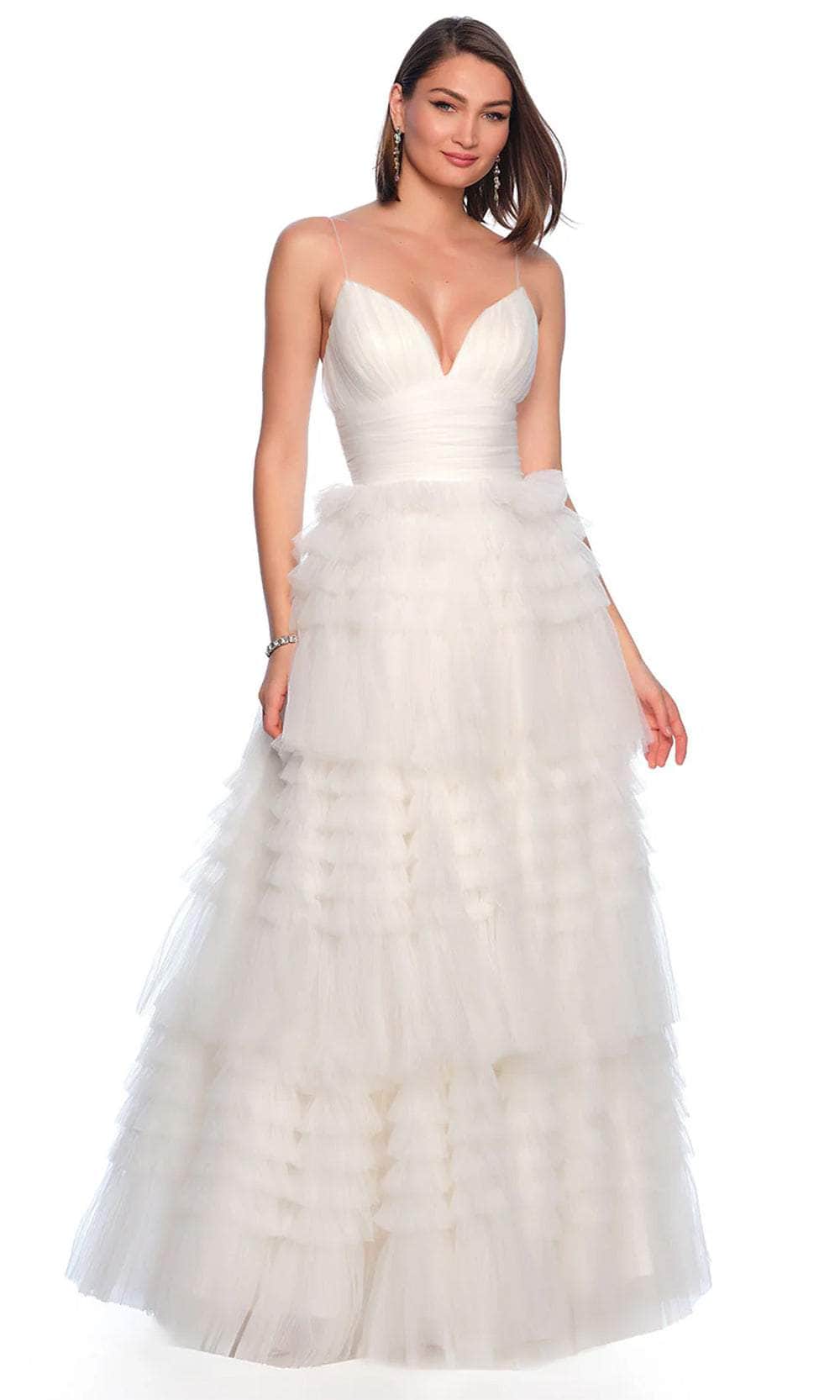 Indulge in ethereal charm with the Dave & Johnny Bridal 11588 creation. This soft tulle gown flatters your figure with a flowing silhouette. The V-neckline and delicate straps create a timeless look, while the empire waist defines your natural beauty. Cascading ruffles add a touch of playful elegance to the A-line skirt. Perfect for the bride seeking understated romance, this Dave & Johnny Bridal 11588 creation will make you a vision of ethereal beauty on your wedding day. Model is wearing the Ivory color.