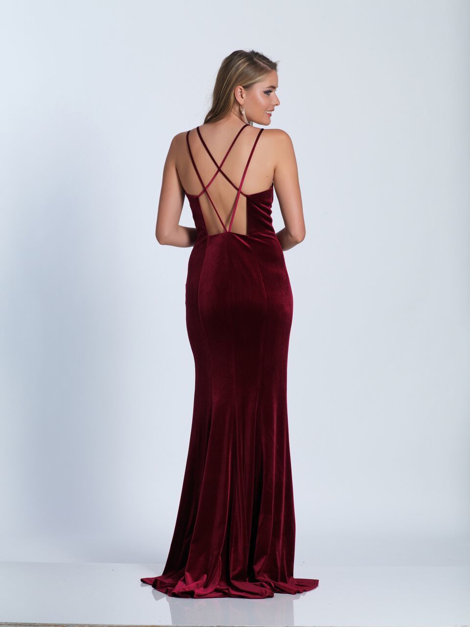 This figure-hugging dress boasts a curved v-neckline held by double spaghetti straps leading leads to the crisscross back. This sheath silhouette dress features a side high slit and finishes at floor length.