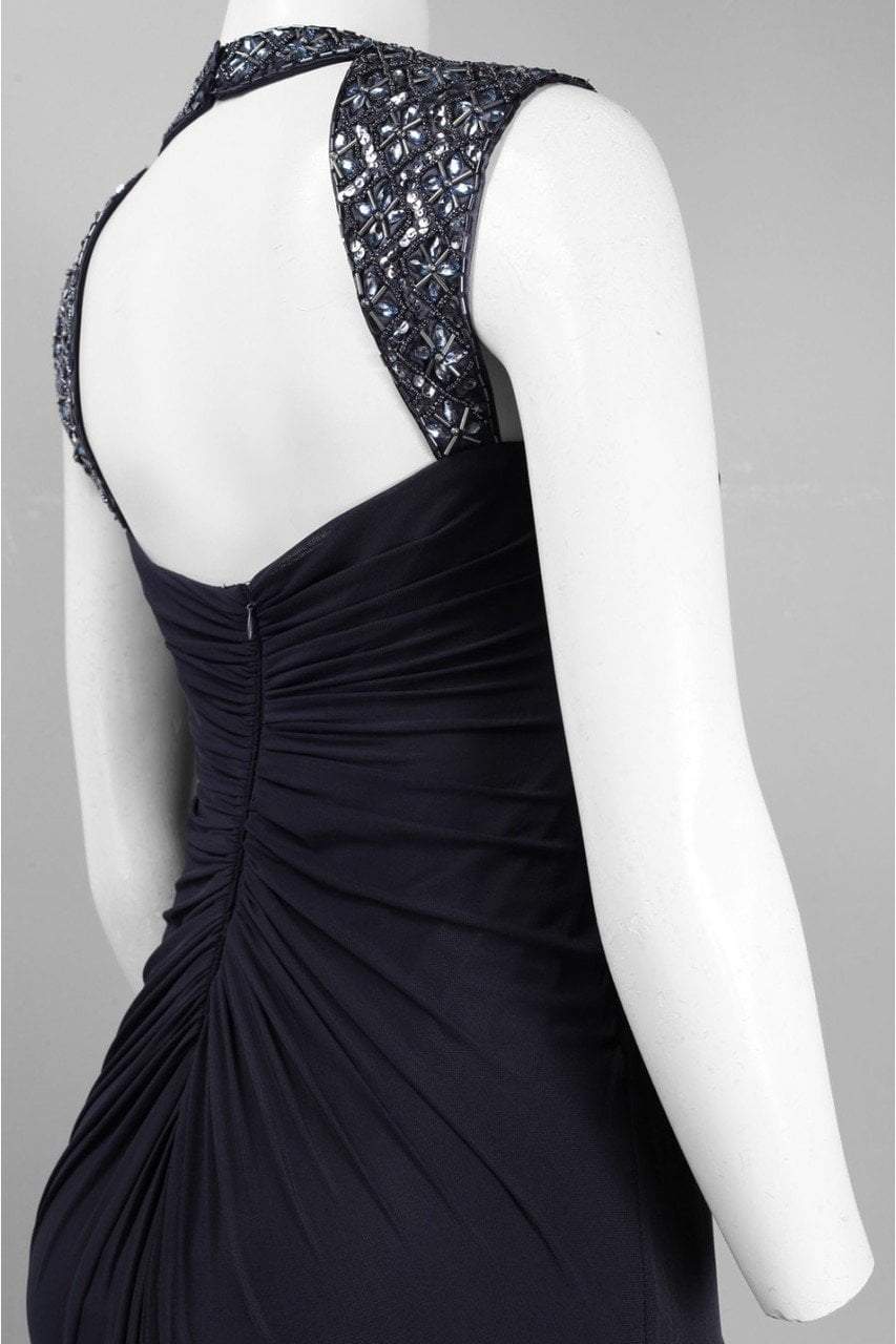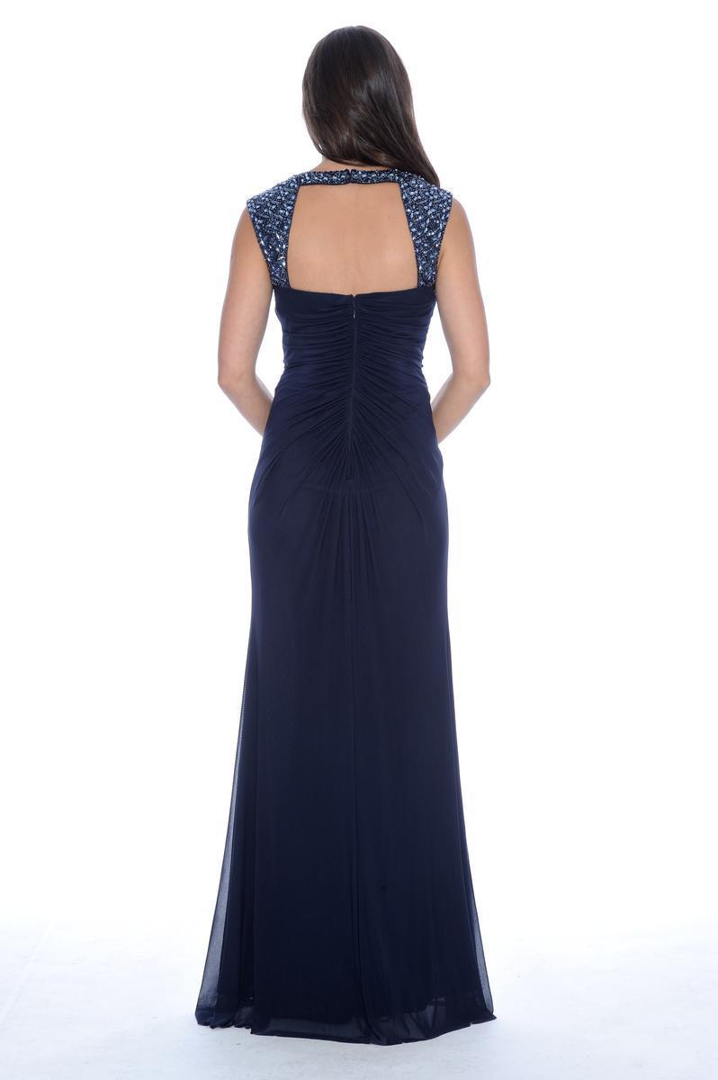 This dress features embellished sleeves in Princess Anne style neckline and a crisscross ruched bodice. The luxurious stretch Jersey fabric is designed with a decadent drape that layers over the length and comes to a full length hemline.