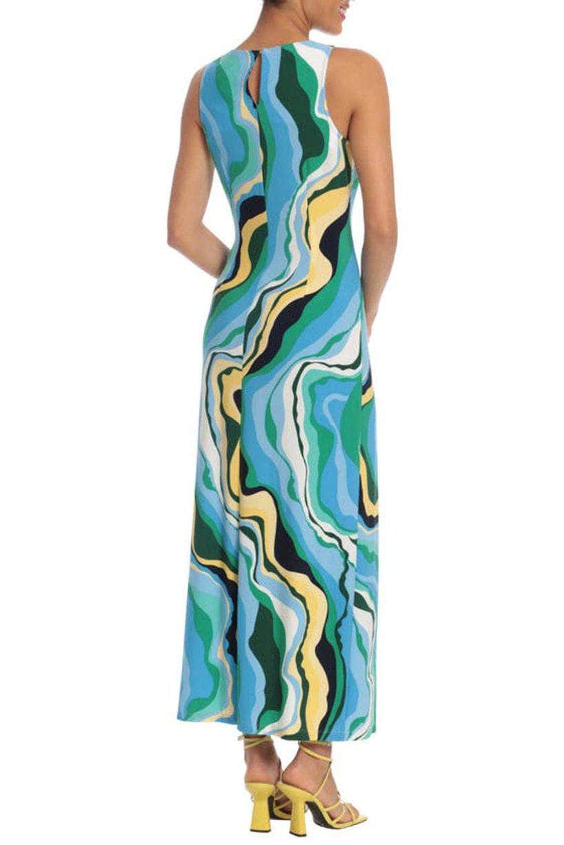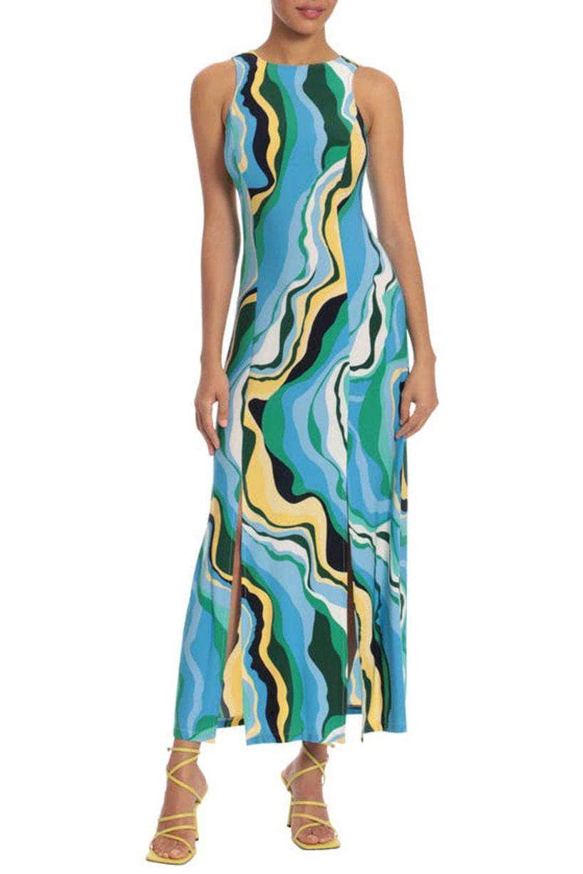 Adorn yourself in an utterly feminine style in this exquisitely styled Donna Morgan DT037M creation. Alluringly detailed with a wavy motif of multi colored print, this beauty showcases a sleeveless bodice with a jewel neckline. Rendered with a full back and accented with a cutout, the sheath skirt reveals double side slits for leg exposure and a full length design. Show off style intensity while flourishing sophistication in this Donna Morgan masterpiece. Model is wearing the White Blue color.
