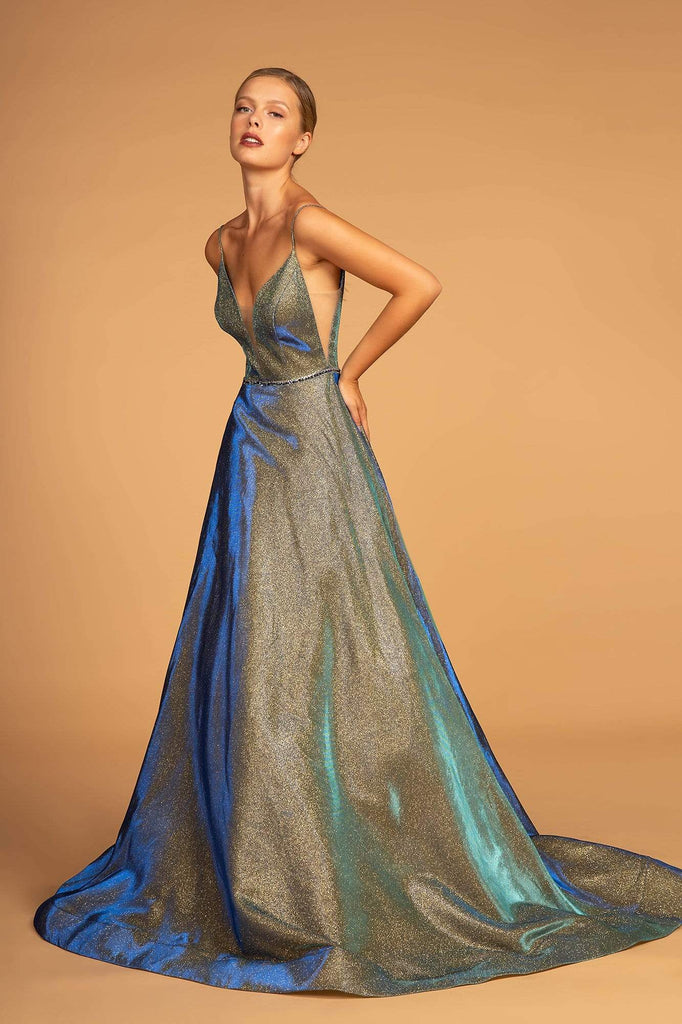 You'll be positively radiant in this glimmering masterpiece with Elizabeth K GL2644. This glitter crepe dress brandishes in a sleeveless, deep V-neckline with spaghetti straps. The bodice is styled with sheer panels and features a low V-back with a zipper closure. The waist is accented with an embellished waist and flourishes a full length A-line skirt with a sweep train finish. Get your DIVA on with this Elizabeth K look.