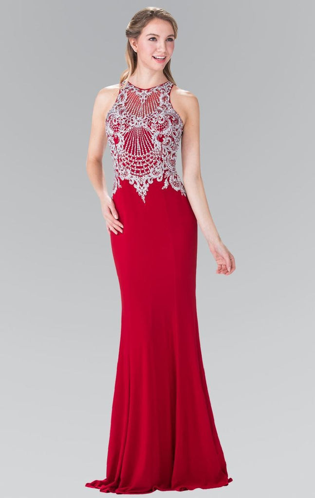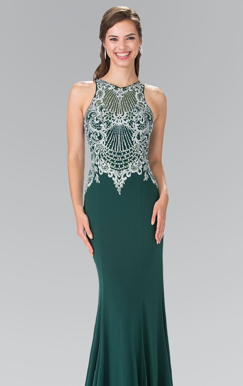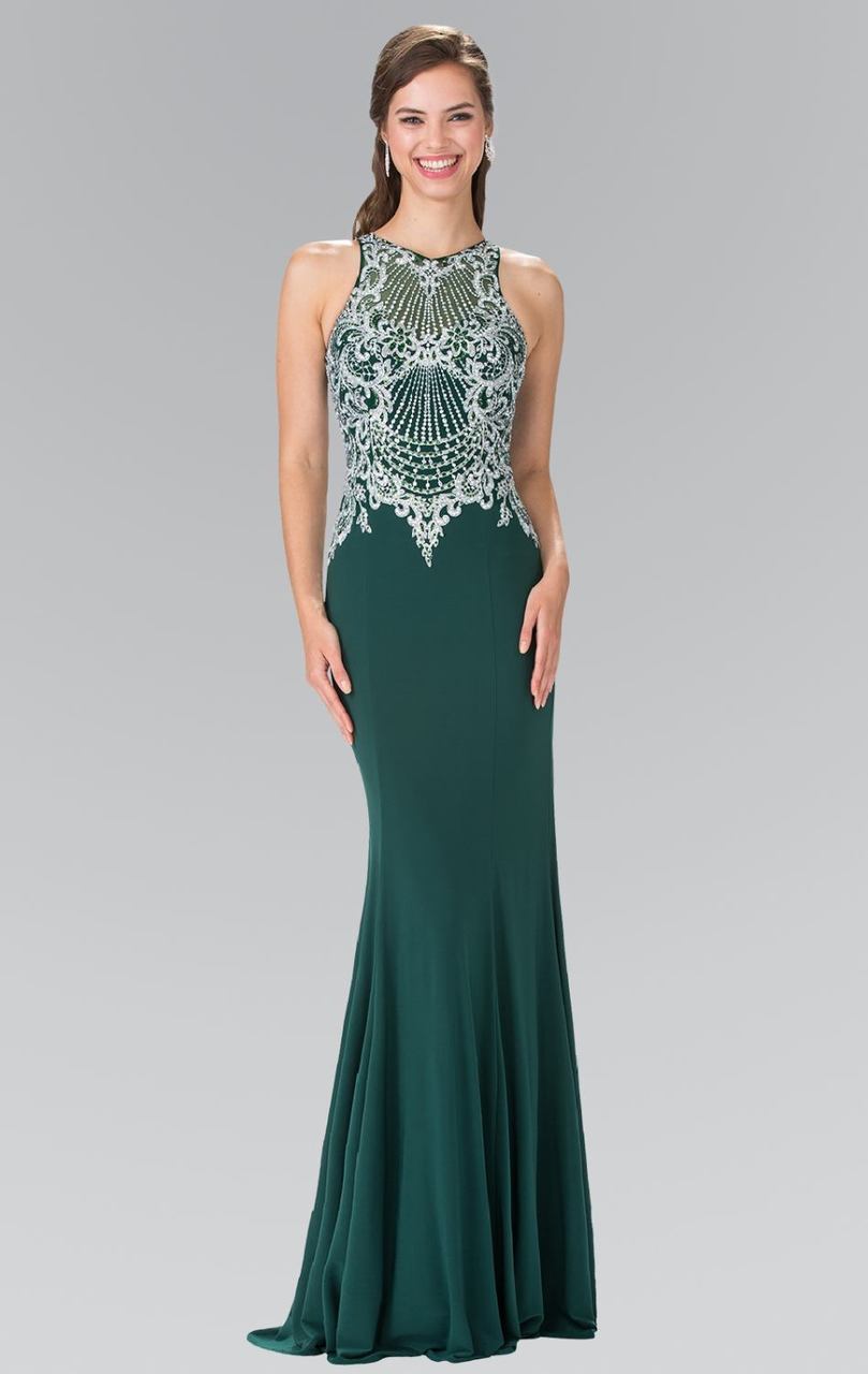 Stand out in every occasion with this daring creation by Elizabeth K GL2232. Trumpet style long jersey dress features a high neckline. It's faint silver embroidery and vertical beading is suggestive of an art deco style. Get noticed in this radiant dress from Elizabeth K.