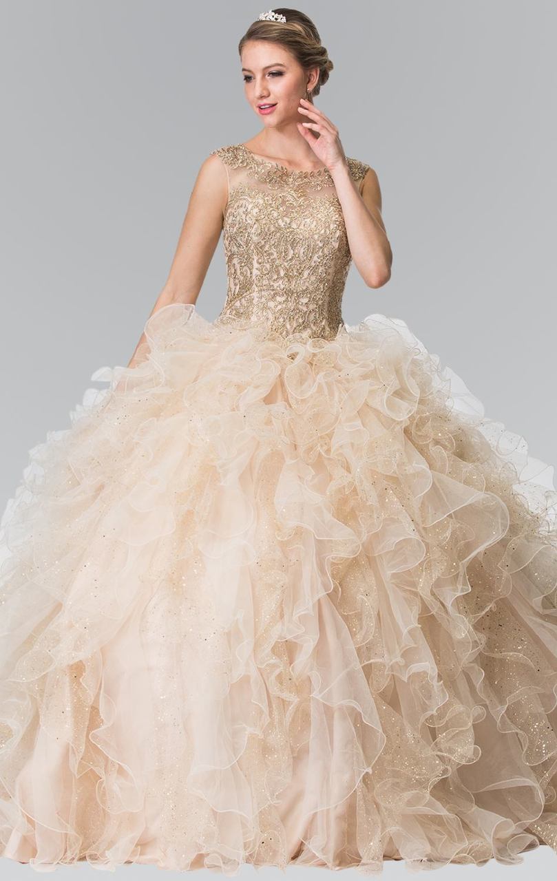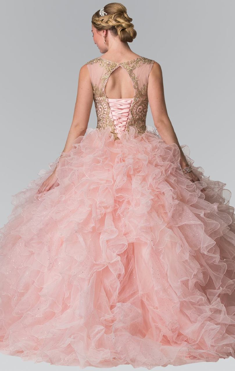 Make yourself into a vision of loveliness in this spectacular full length ball gown by Elizabeth K GL2208 Quinceanera Ball gown. Featuring a full ruffled mesh skirt, sleeveless, jewel neck with embroidered and beaded bodice with sweetheart illusion and cut out with corset style back. This Elizabeth K creation is sure to create a striking look that is sure to make anyone remember your grand entrance. Find more ball gowns.