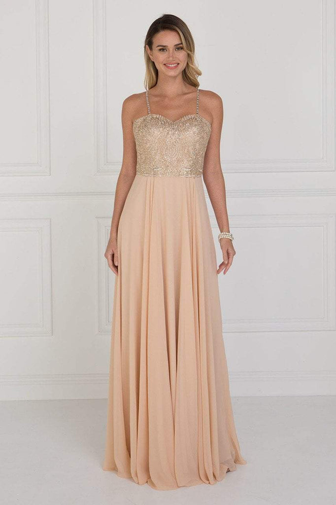 Optimize the attraction of your special event in this alluring dress by Elizabeth K GL1571. Showcases a sleeveless, spaghetti strapped, sweetheart neckline with bodice lavishly ornate with gold embroidery and lace appliques. The back has a lace up closure and a back zipper closure while a chiffon A-line skirt runs in full length hem with mini train. Wrap up in this winning style for evening by Elizabeth K.