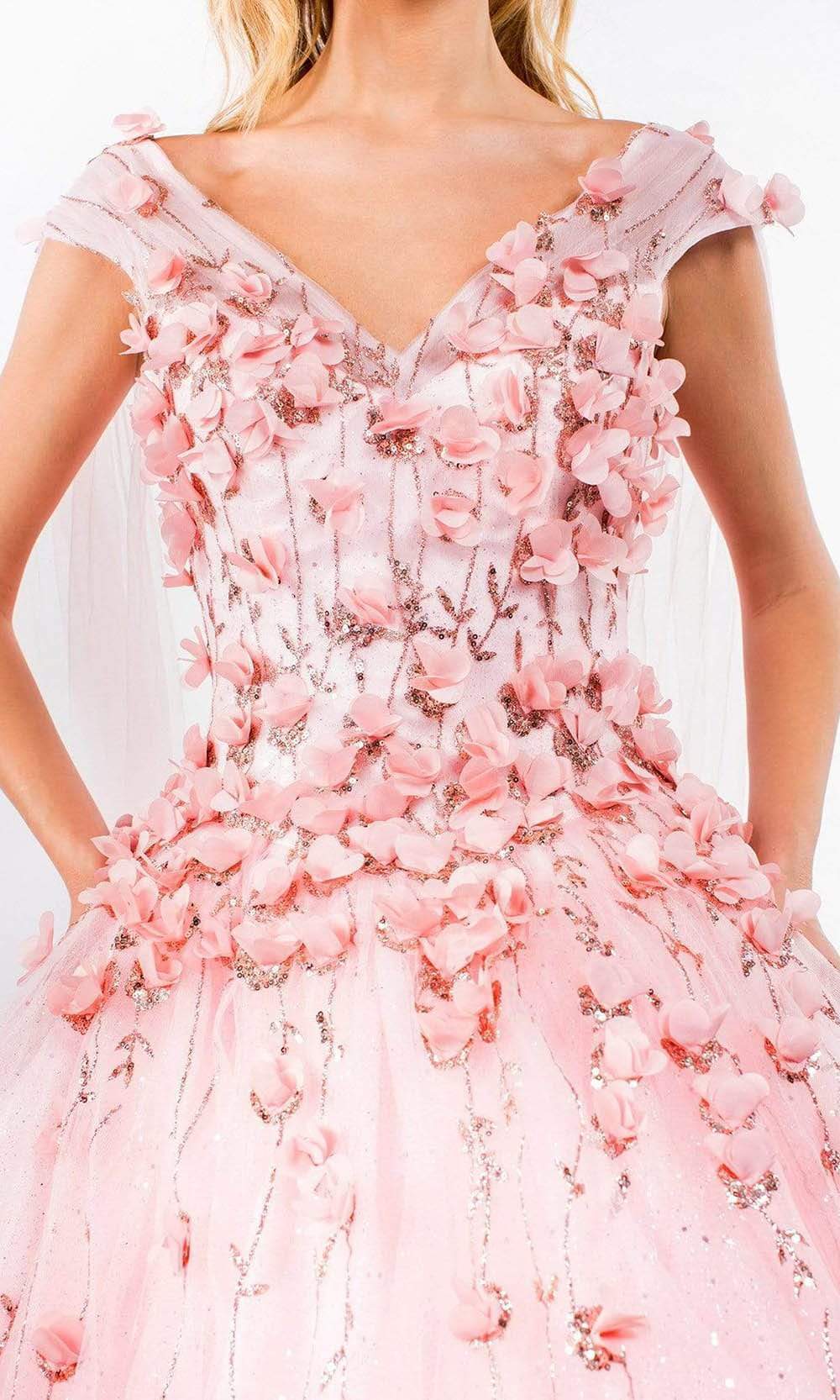 Blossom into a sophisticated stunner in this fascinating Elizabeth K GL1974 creation. Adorned with 3D floral appliques and sequined glitter details, this piece creates a portrait v-neckline. The short sleeves streams with cascading cape drapes. Crafted with a scoop back and corset accents, the glitter ornate skirt showcases a ballgown silhouette with a floor length hem. Have all eyes linger on you in this Elizabeth K masterpiece. Find more Corset Prom Dresses.