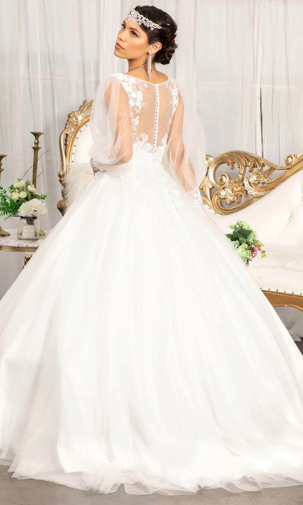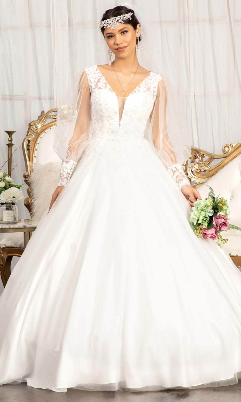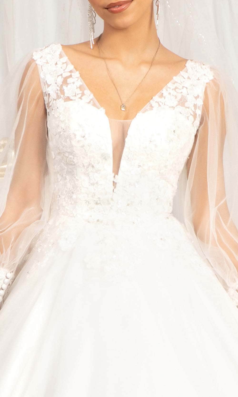 Make your grand entrance in this Elizabeth K GL1981 ensemble. This gorgeous wedding gown features a plunging V-neckline with mesh inset and sheer long sleeves accented by cuffs and buttons. The fitted bodice is covered with floral lace appliques, sequins and beads as it continued to style the sheer back. A glimpse of skin offers the illusion back as it complements the extravagant skirt descending to a floor length hem finishes in a sweep train. Fascinate the crowd wearing this exceptional Elizabeth K masterpiece.