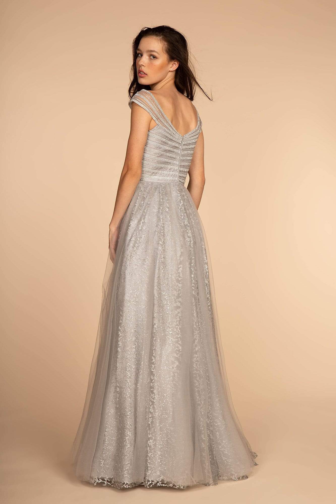 Make a dramatic debut as you saunter the ballroom in this Elizabeth K GL2526 creation. With crystals paving the cap sleeves and the scintillating bodice, this stunner shows a v-neckline and a jeweled scoop open back. Shimmering glitter accents the skirt as in layers into a full-length skirt and a fluttering hem at the feet. Sparkle while making a lasting impression in this Elizabeth K masterpiece.