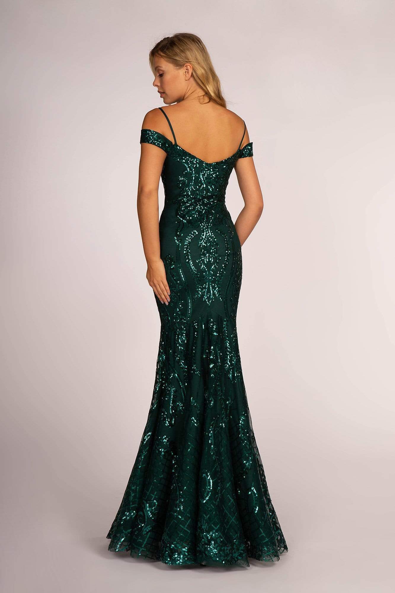 Take a look at this breathtaking evening dress by Elizabeth K GL2552. Beautifully fashioned in a sequin embellished tulle fabric, this stunner showcases a fitted bodice with a sweetheart neckline that features a semi-deep notch panel covered with sheer mesh. The sleeves brandishes in a cut-in cold shoulder style held by spaghetti straps. From the natural waist, The skirt gorgeously flickers to full length as it finishes with a mermaid flare for that dramatic finish. This Elizabeth K style will make sure you turn heads all night long.