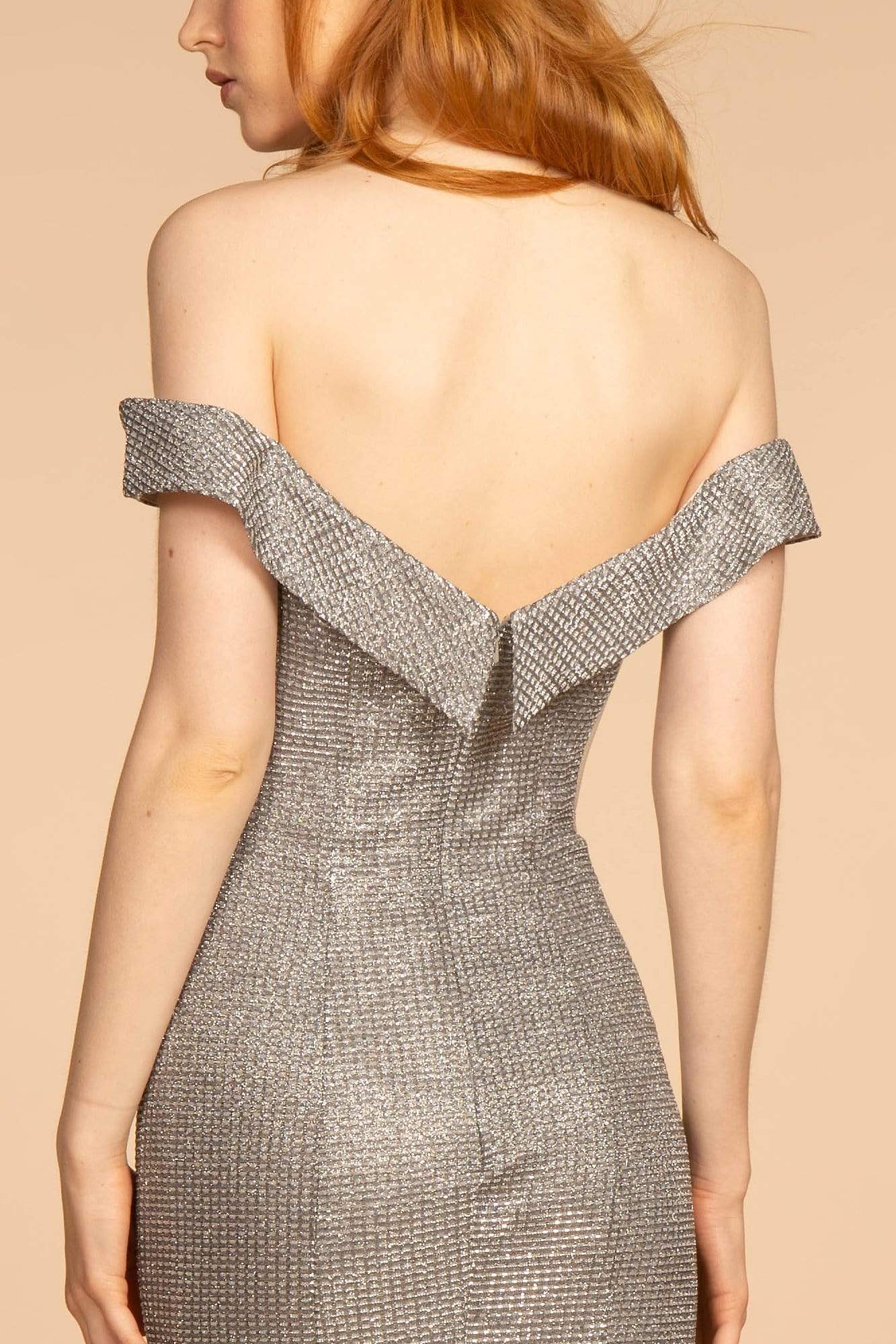 Make an extraordinary statement when you walk in this classy dress by Elizabeth K GL2562. This glitter crepe dress charms in a foldover off the shoulder neckline. The dress flatters your figure with its fitted bodice and accented with sheer side panels. The skirt brings drama with its mermaid silhouette and sweep train finish. Turn yourself into a timeless beautiful goddess in this creation by Elizabeth K.