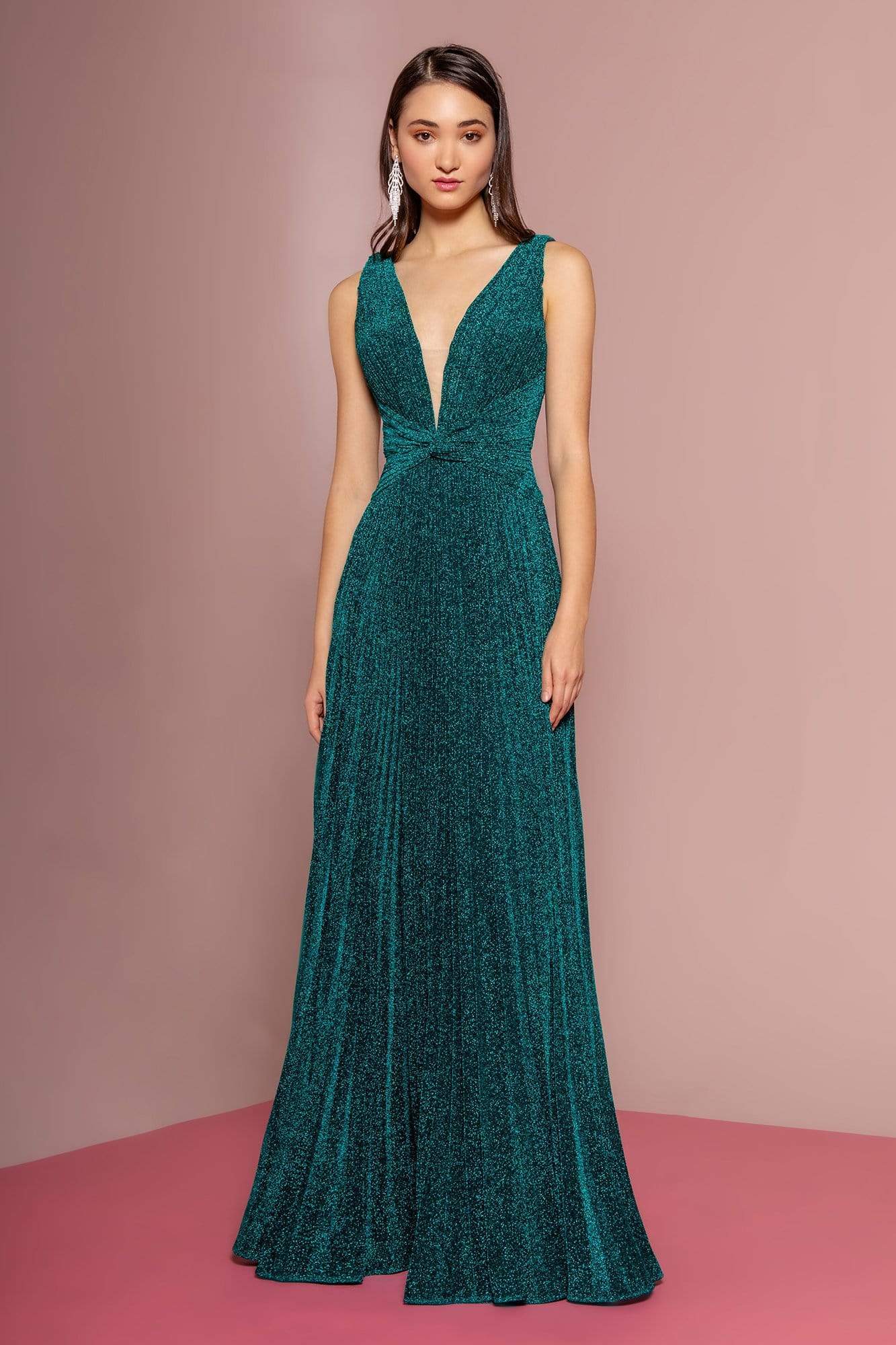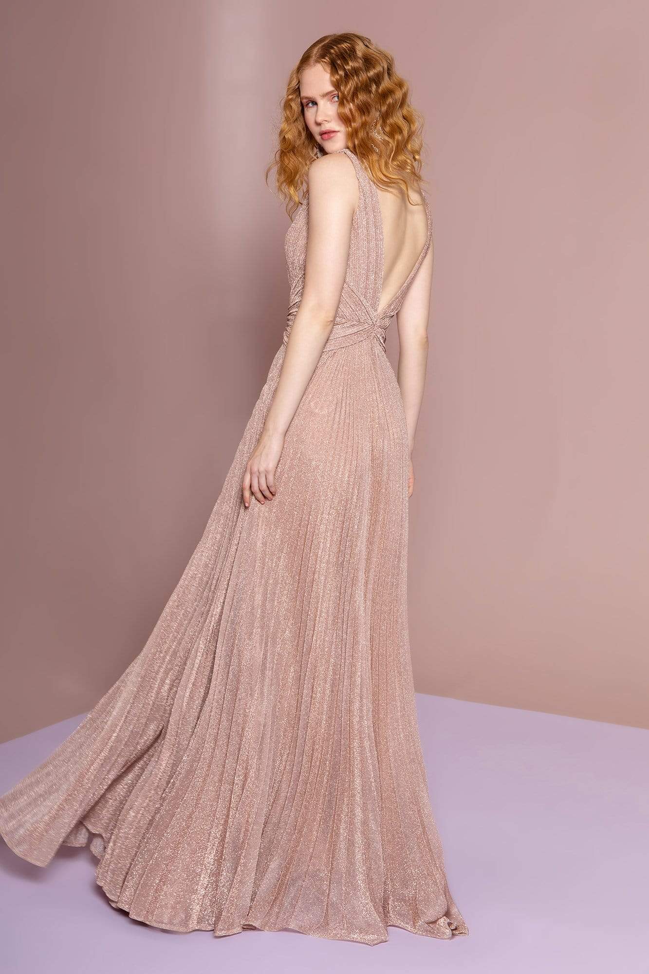 This Elizabeth K GL2687 dress is a charming choice for your next special occasion. Made of lame fabric, this dress captivates in a sleeveless, deep V-neckline with a twisted ruched waist. The dress flaunts a low V-back and has a zipper closure. The skirt opens in an A-line silhouette and runs in full length hem. Be the center of attention in this glamorous Elizabeth K dress.