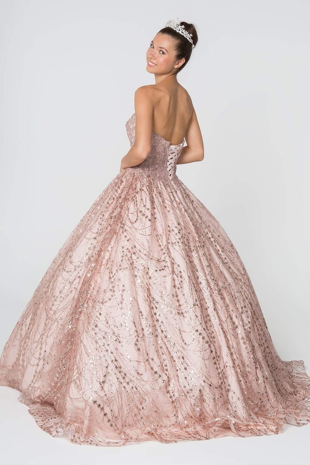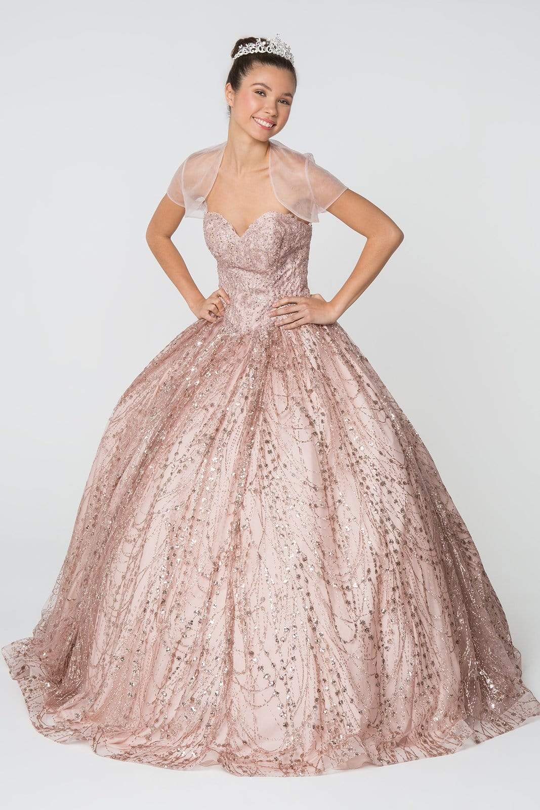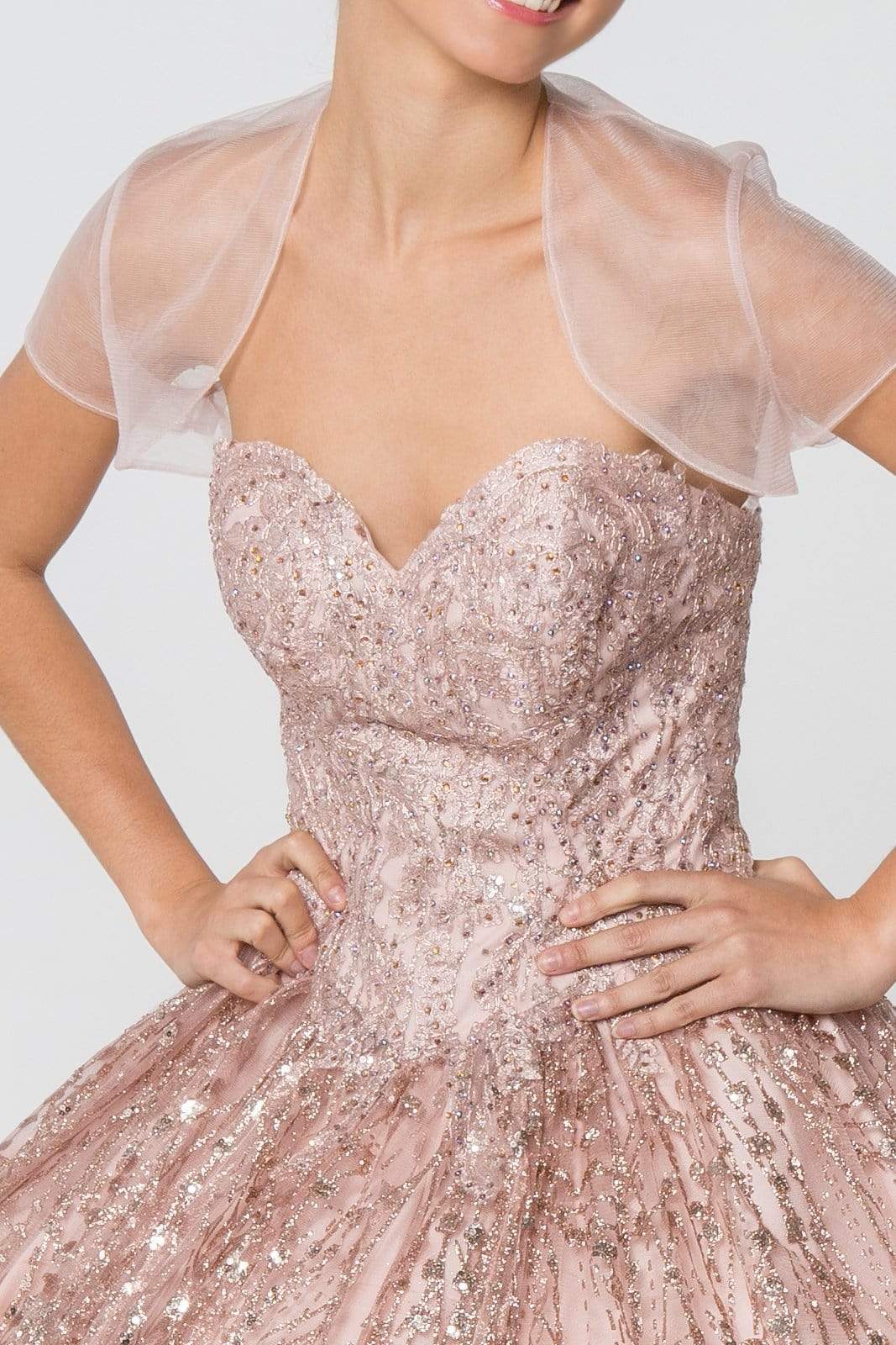 Shine through the night in this mesmerizing look by Elizabeth K GL2804. This captivating gown flashes a strapless, sweetheart neckline with a corset bodice. The skirt opens in a voluminous ballgown silhouette. The gown is complemented with a matching mesh bolero. This Elizabeth K gown will let you shine like the star that you are. Model is wearing Burgundy color.