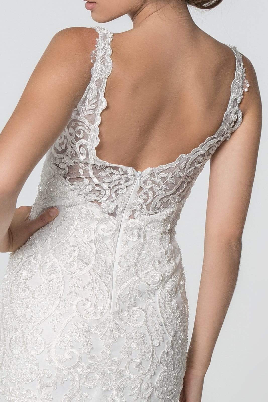 You are certain to capture the hearts and attention of everyone at your wedding when you walk down the aisle in the glamorous Elizabeth K GL2815 masterpiece. Sophisticatedly designed in lace mesh fabric, the fitted bodice features a V neckline supported with thin straps which leads to the open U back. The mermaid skirt is beautifully designed with pleated skirt as it flares to the floor, dramatically finished with a mesh trail. Make a lasting impression with this Elizabeth K ensemble.