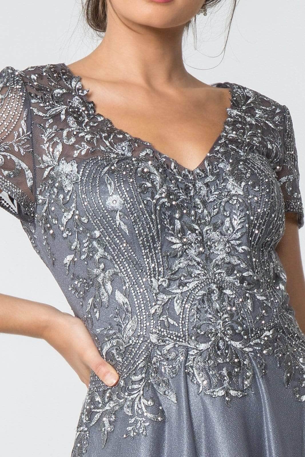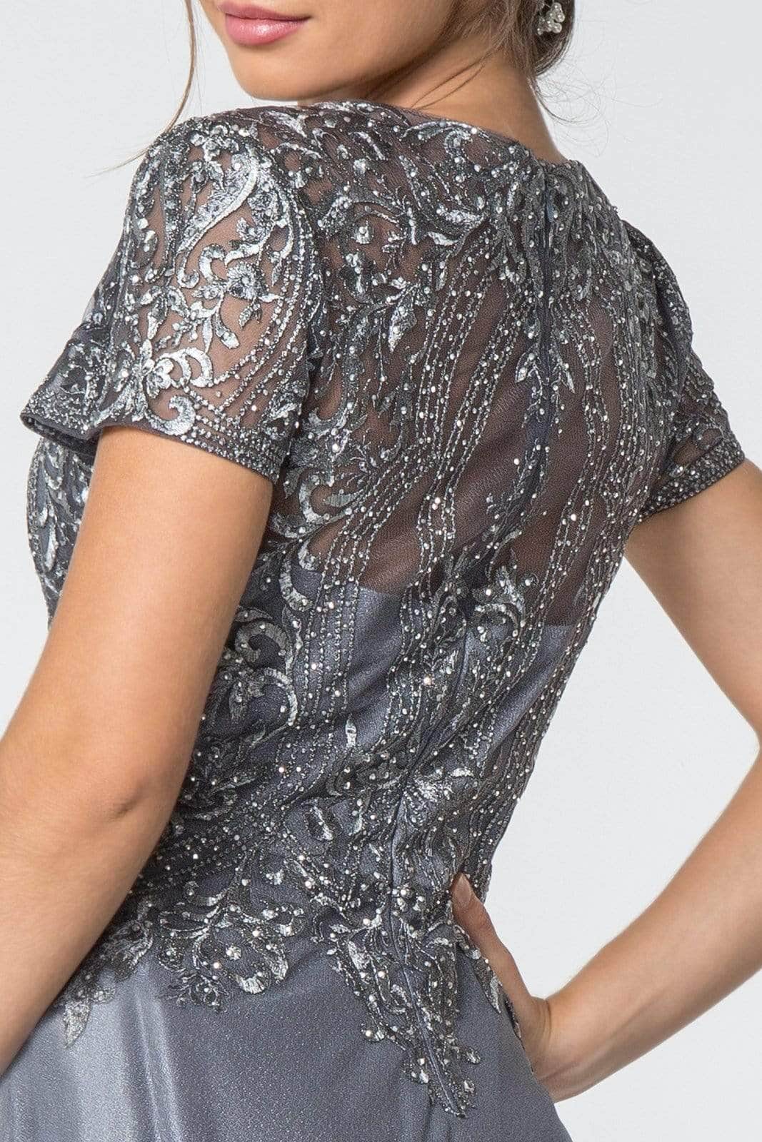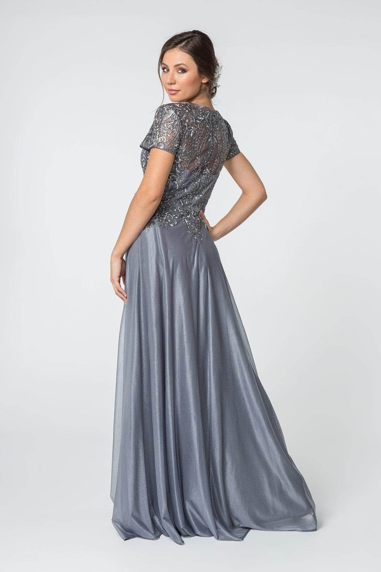 Be beautiful in this elegant Elizabeth K GL2829 masterpiece. The floral embroidery and sparkling rhinestone adornment on the top bodice add a touch of opulence. It showcases a sheer v-neckline and short sleeves as well as a partial illusion full back. The chiffon A-line skirt flutters softly as it glides to the full length hem and a subtle train. Fall in love when you slip on this Elizabeth K GL2829 long gown. Models are wearing the Navy, and Silver colors.
