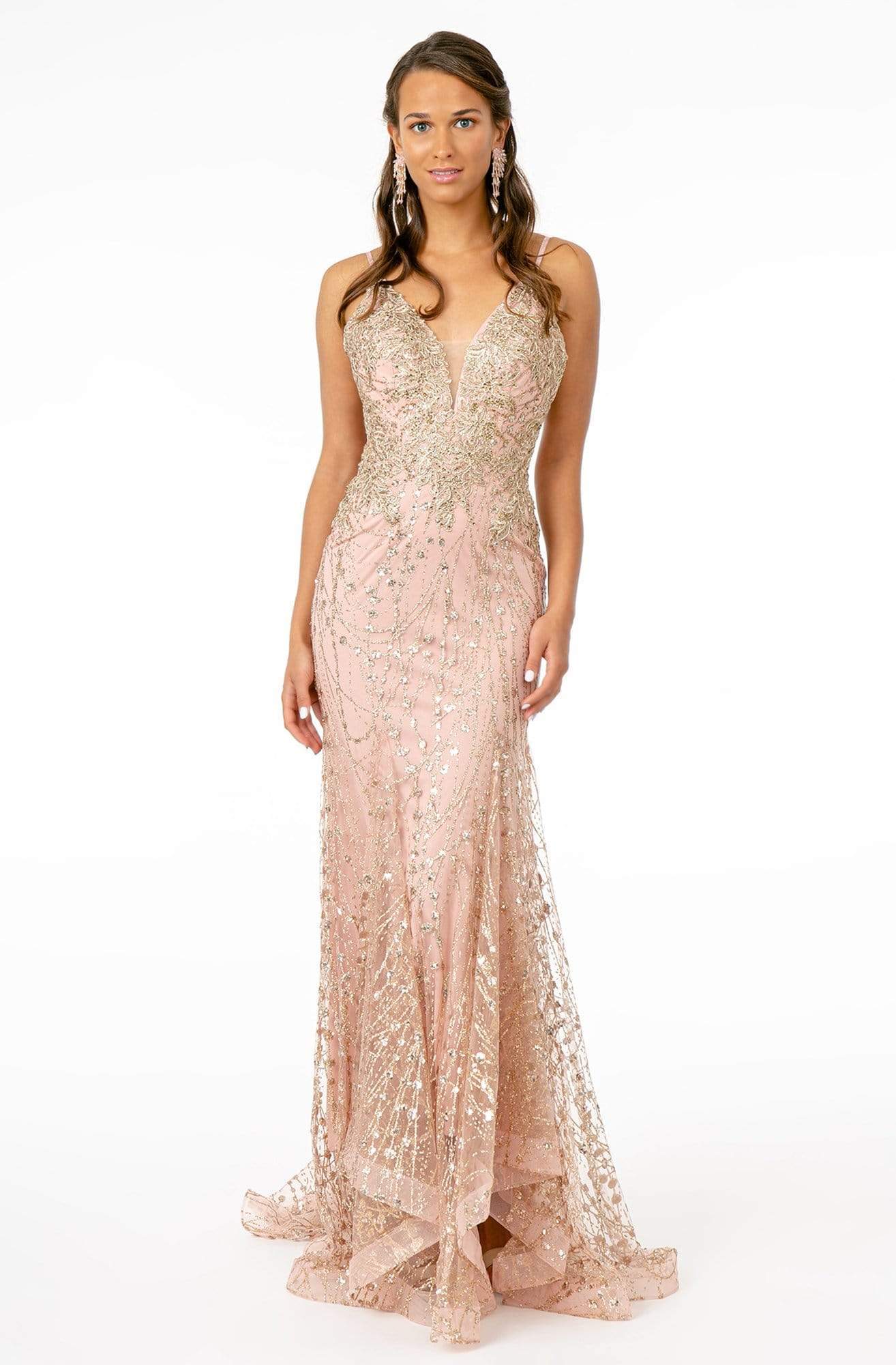 Promote attention-grabbing style in this stunning Elizabeth K GL2938 masterpiece. The whole dress is strikingly designed with glitter embellishments as the fitted bodice showcases a plunging V neckline with sheer inset detail at the bust. Spaghetti straps lend support to the top as it leads to the lace up open back. The skirt displays a mermaid silhouette which cascades to a full length hemline, finished with a sweep train. Beam with pride with this Elizabeth K creation.