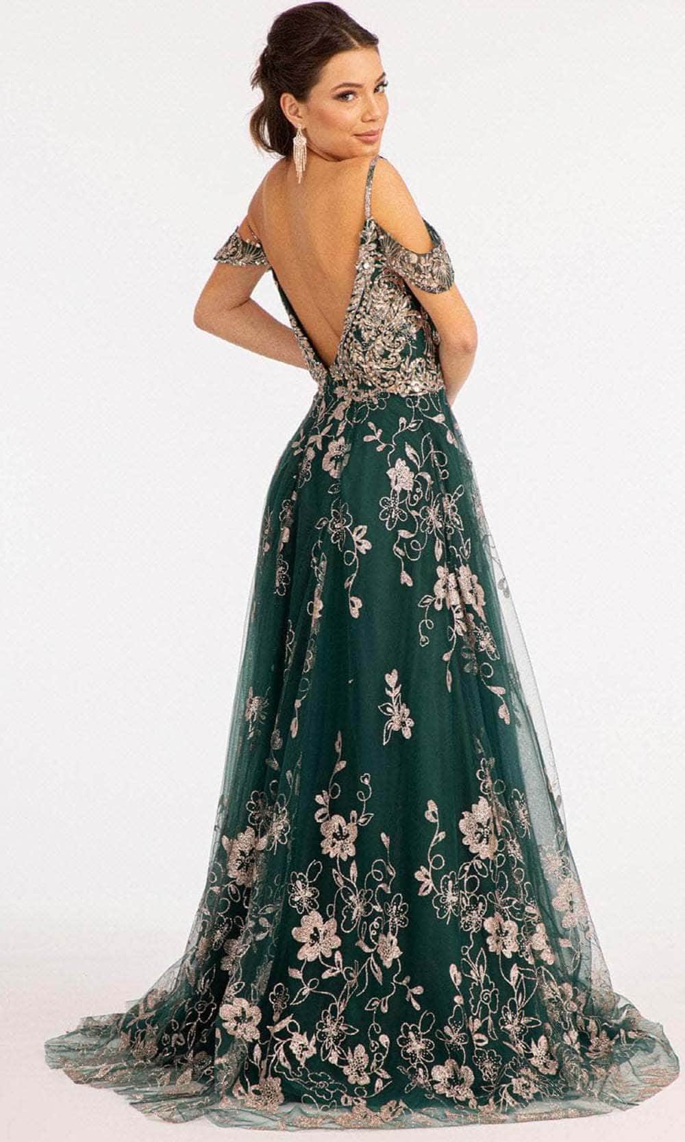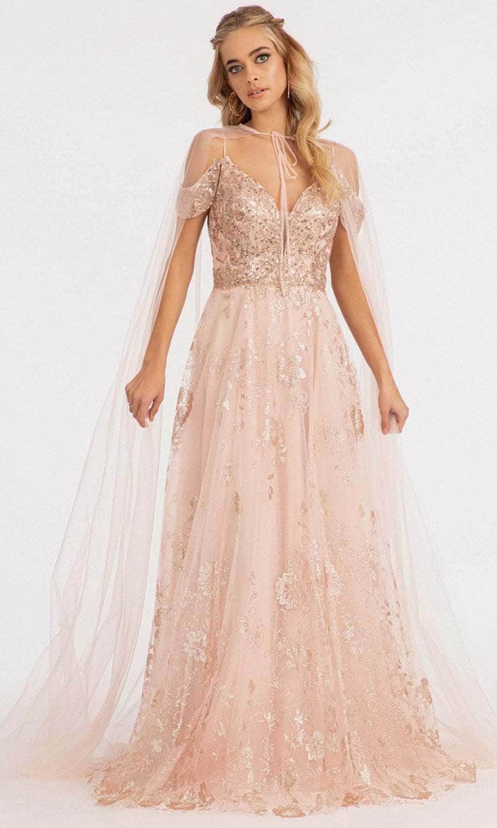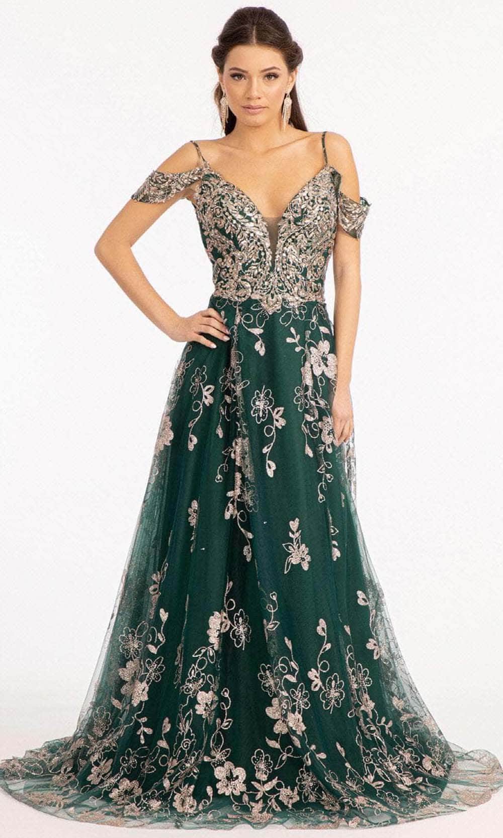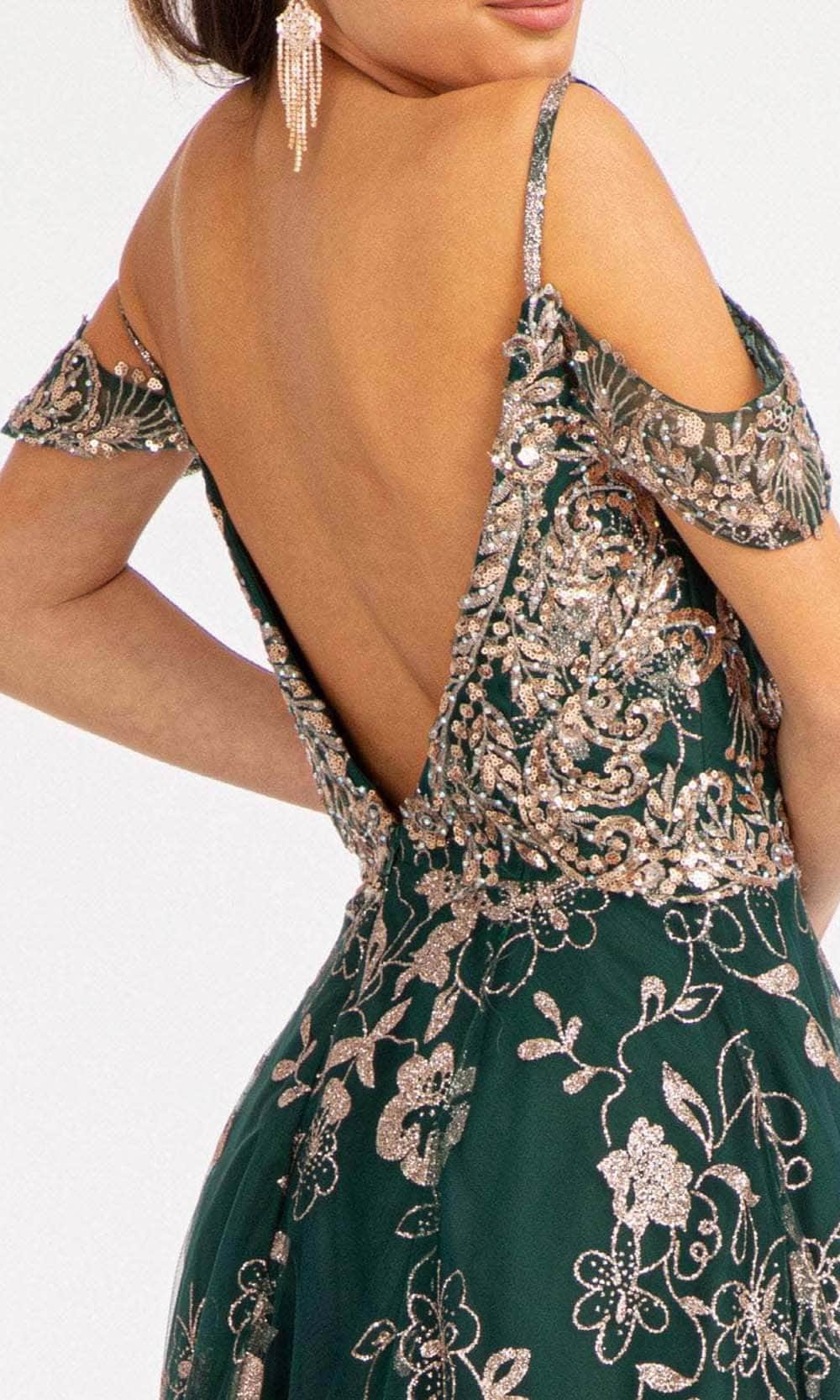 Create a perfect evening wearing this elegant formal dress from Elizabeth K GL3070. Increase the glitz and shine to your ensemble! Make a statement in this stunning mesh A-line dress, which is embellished with intricate embroidery and sparkling sequin embellishments. The illusion V-neckline with cut-off shoulder adds a whimsical touch, while the wide open V-back creates a classy impression. A sweep train finish completes the A-line skirt. Fall in love when you slip on this Elizabeth K creation.