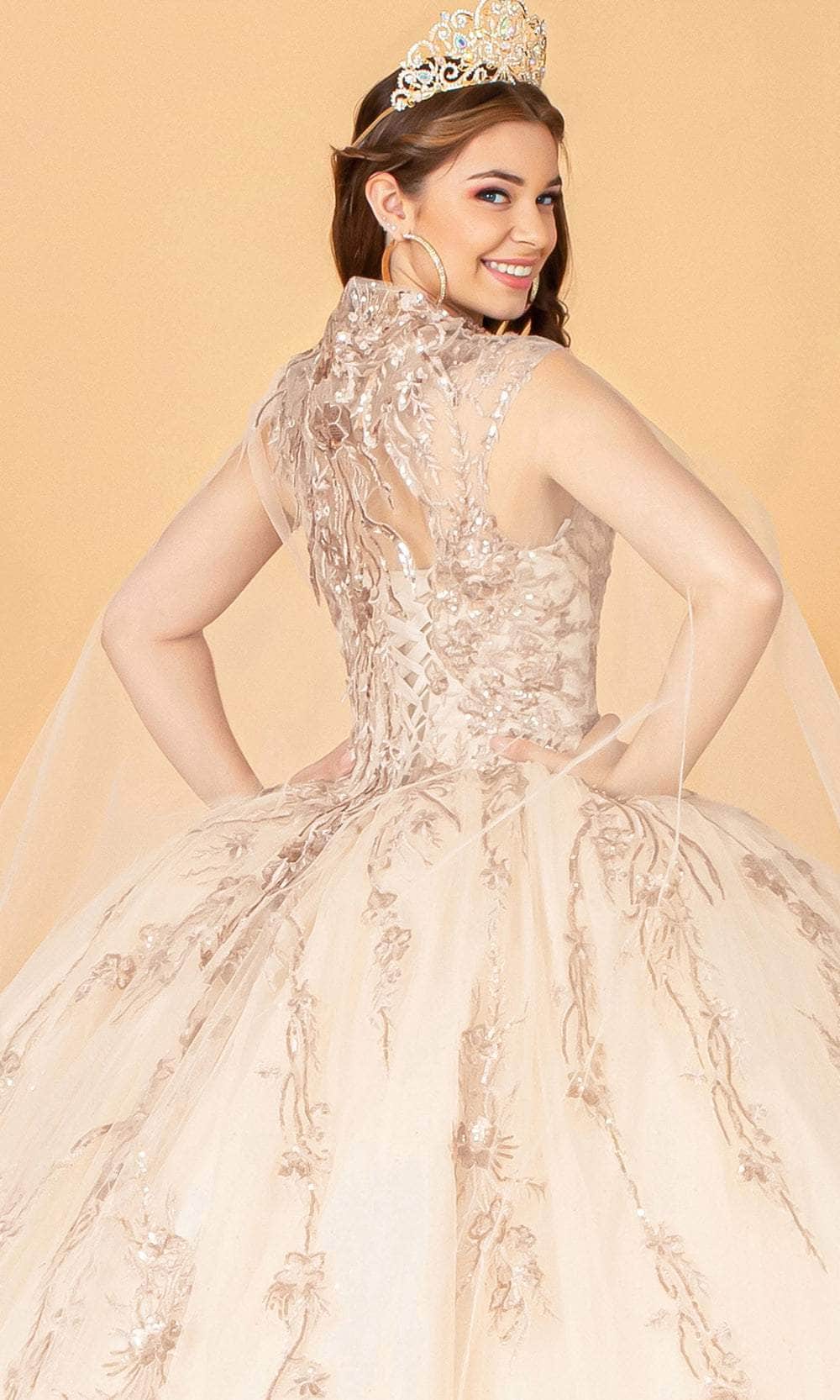 Render everyone speechless when you show up in this Elizabeth K GL3076 creation. Festooned with a gilt designed appliques, this gown shows a classy V-neckline with a sweetheart notch. Sheer mesh cape frame this beauty and adds elegance. An appliqued cutout design ornate the corset back accent. The glitter tulle ballgown skirt is defined with metallic lace appliques as it flows to the floor with a subtle train. Bloom with beauty in Elizabeth K GL3076 Quinceanera gown. Models are wearing Champagne, Green, and Red colors. Find more Quinceanera Dresses.