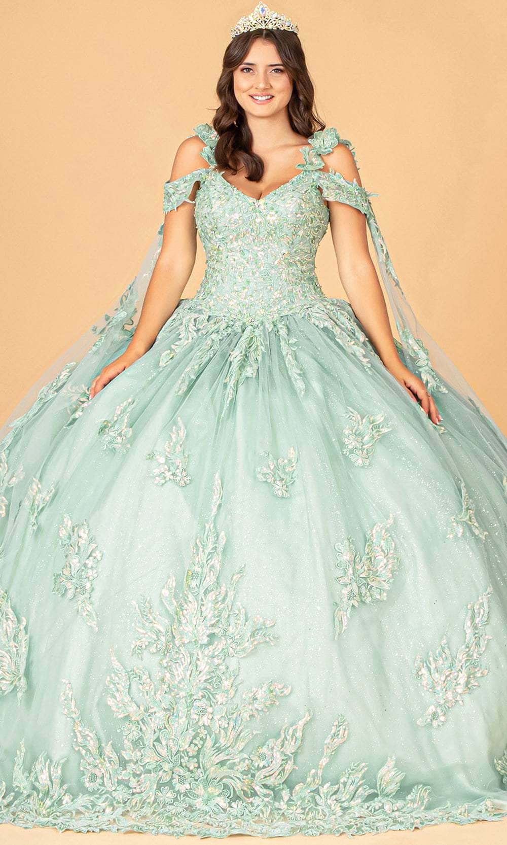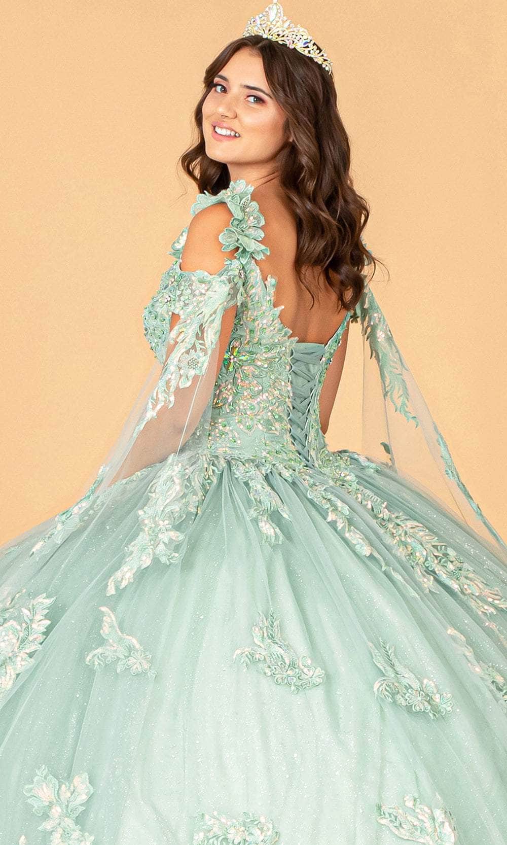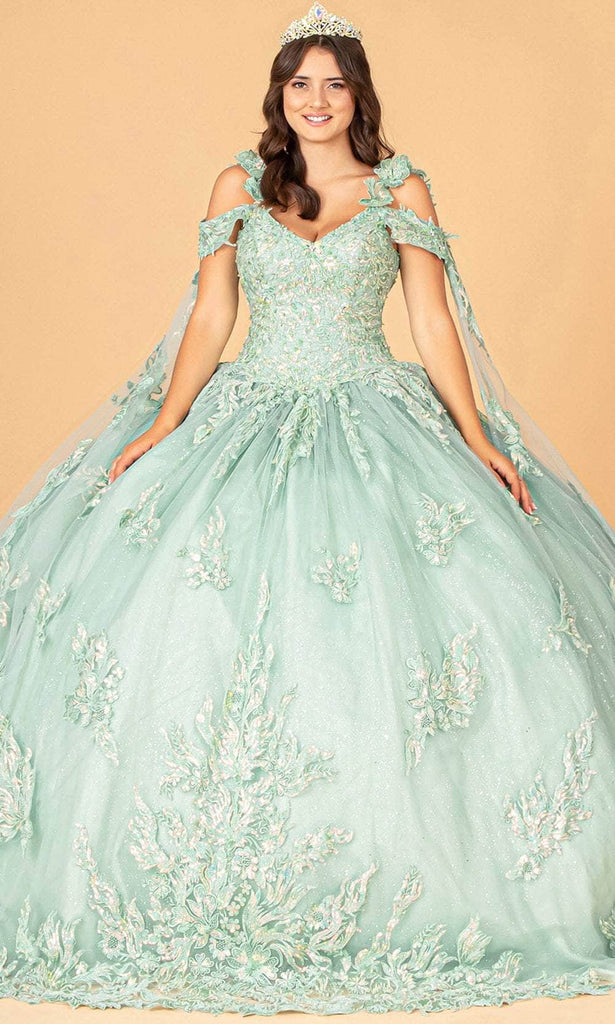 Make it your moment to shine in this lavishly embellished ballgown from Elizabeth K GL3099. Appear queenly on this exquisite long gown that flaunts cold shoulder sleeves over a V-neck, fitted bodice. Adorned all over with sophisticated embroidery and floral appliques, this gown features a side draped mesh around your arms, which gives you a fanciful touch. Rendered with a basque waist, the back is cinched with a corset style. Festooned with bead embroidered appliques, the ballgown skirt is crafted in tulle fabric that cascades into a trail of train. You will be the envy of the night in this striking ballgown by Elizabeth K GL3099. Model is wearing Sage color.