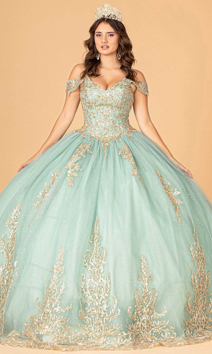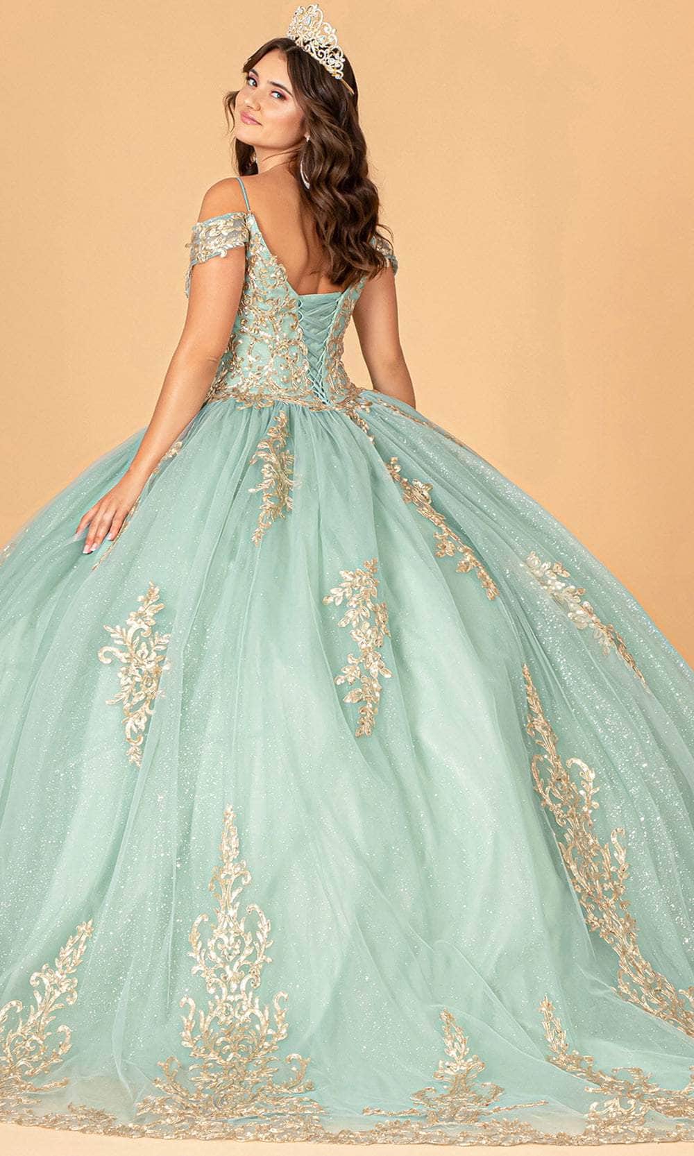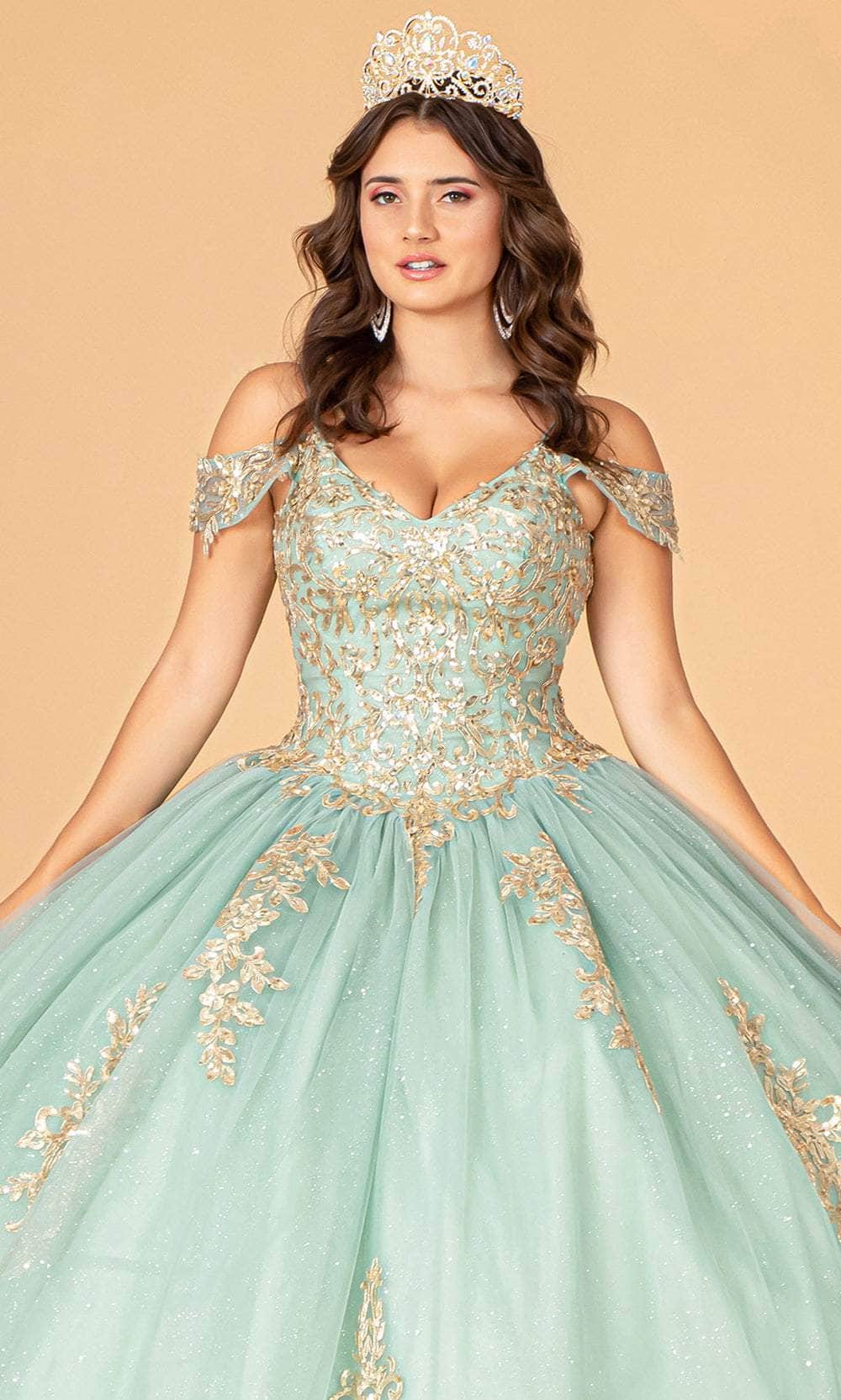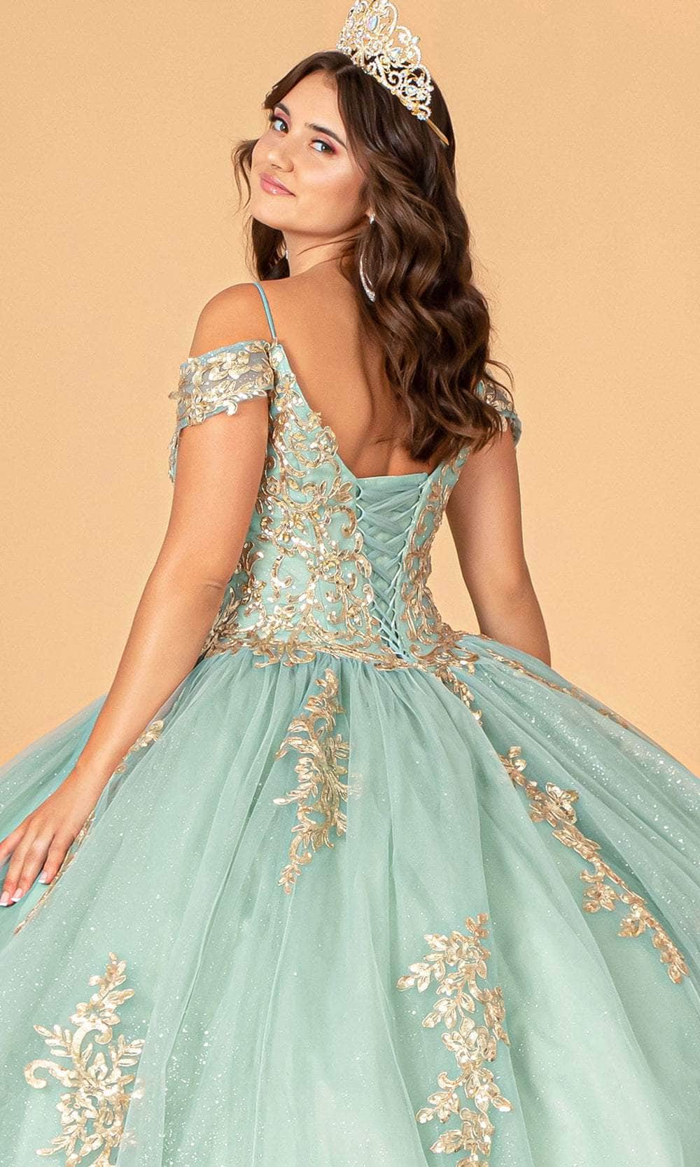 Rise above the rest in class as you make a grand entrance in this inspired Elizabeth K GL3100 creation. Feel like a royal in this beautiful, floor-sweeping gown. It boasts a deep V-neck and cold-shoulder sleeves. This dress is adorned with glittering sequins, shower of beads, and beautiful gold metallic embroidery. The waist is cinched in a basque style, and the back is laced-up. The tulle ball gown skirt is full and flared for a graceful look. Opt for stunning allure in this gorgeous Elizabeth K GL3100 masterpiece. Model is wearing Sage color.