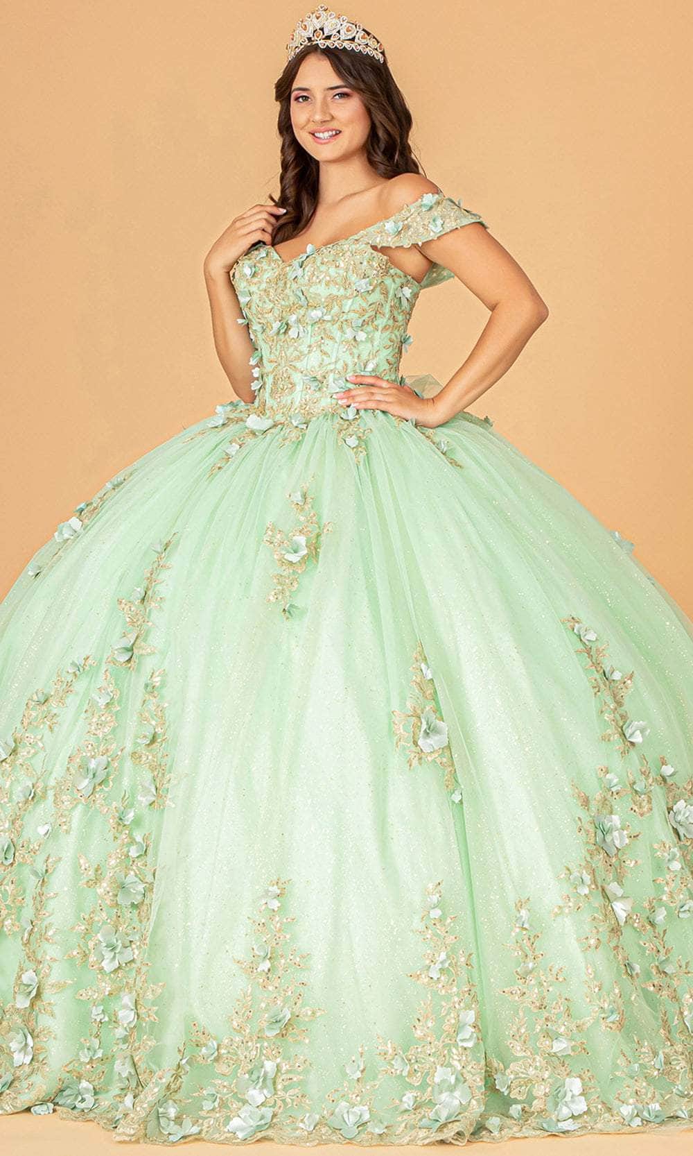 Go beyond beautiful in a precious gown from Elizabeth K GL3102. This glamorous gown showcases a fitted bodice with shower of beaded lace and floral appliques, framed with a sweetheart neckline and off-shoulder sleeves. The skirt reveals a fabulous ballgown silhouette as it cascades to the floor finished with a sweep train. The back flaunts a crisscross straps in a corset closure. Look and feel runway ready in this elegant Elizabeth K GL3102. Model is wearing Sage color.