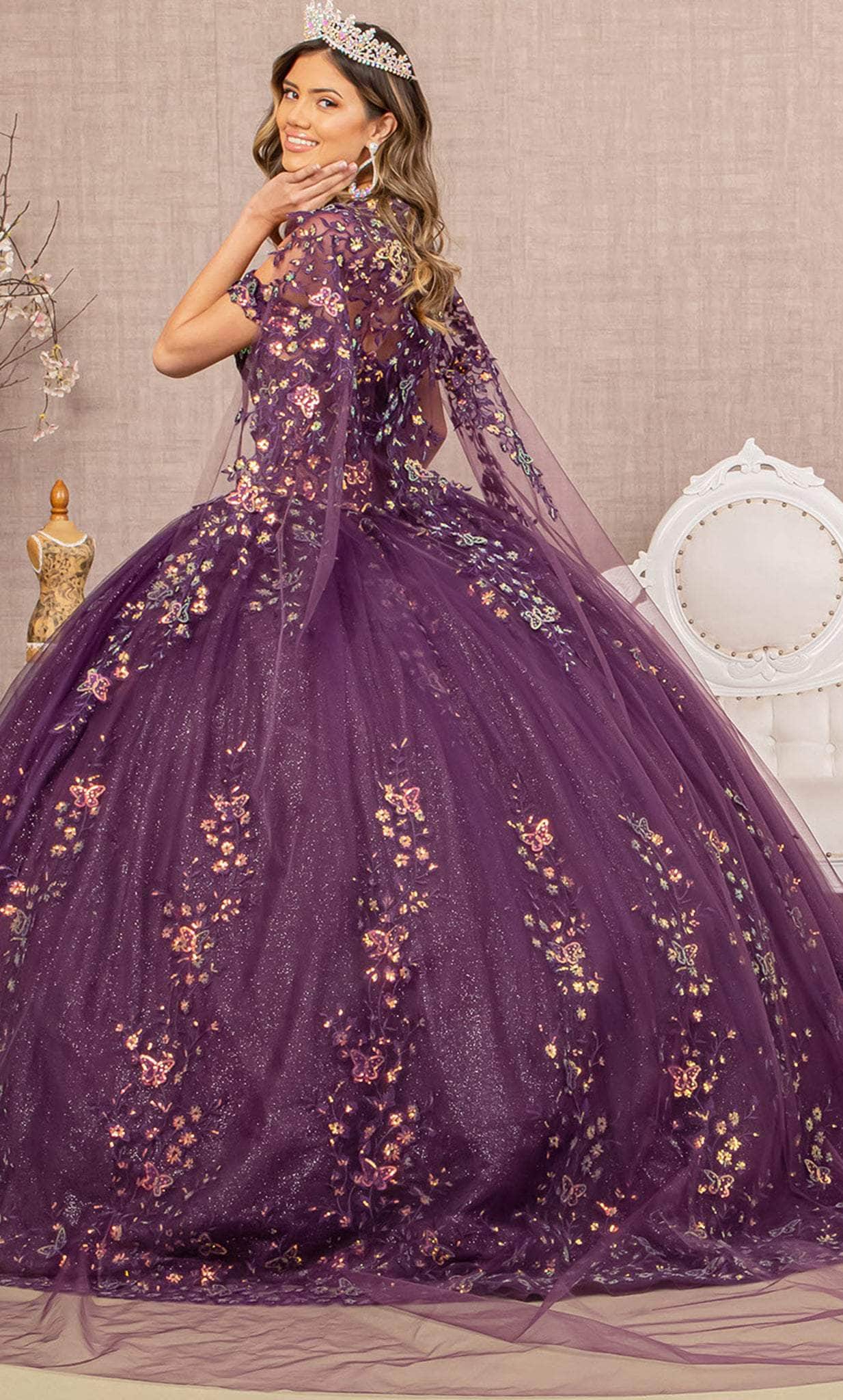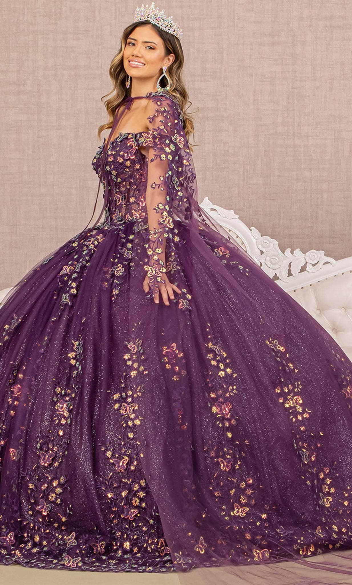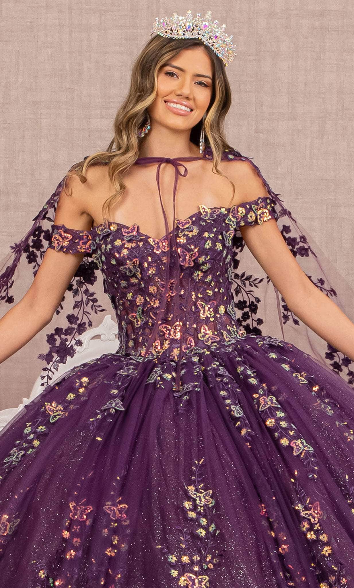 Elegant and alluring, this sophisticated gown from Elizabeth K GL3171 is ready to shine at any event. Has noticeable butterfly applique all over that shines with glitters and sequins. Boasts an off shoulder sleeves and sweetheart neckline on a bodice shaped with the help of corset. The voluminous ball gown silhouette reaches floor length and finishes with a sweep train finish. You are statuesque in a posed gown from Elizabeth K GL3171. Model is wearing Purple color.