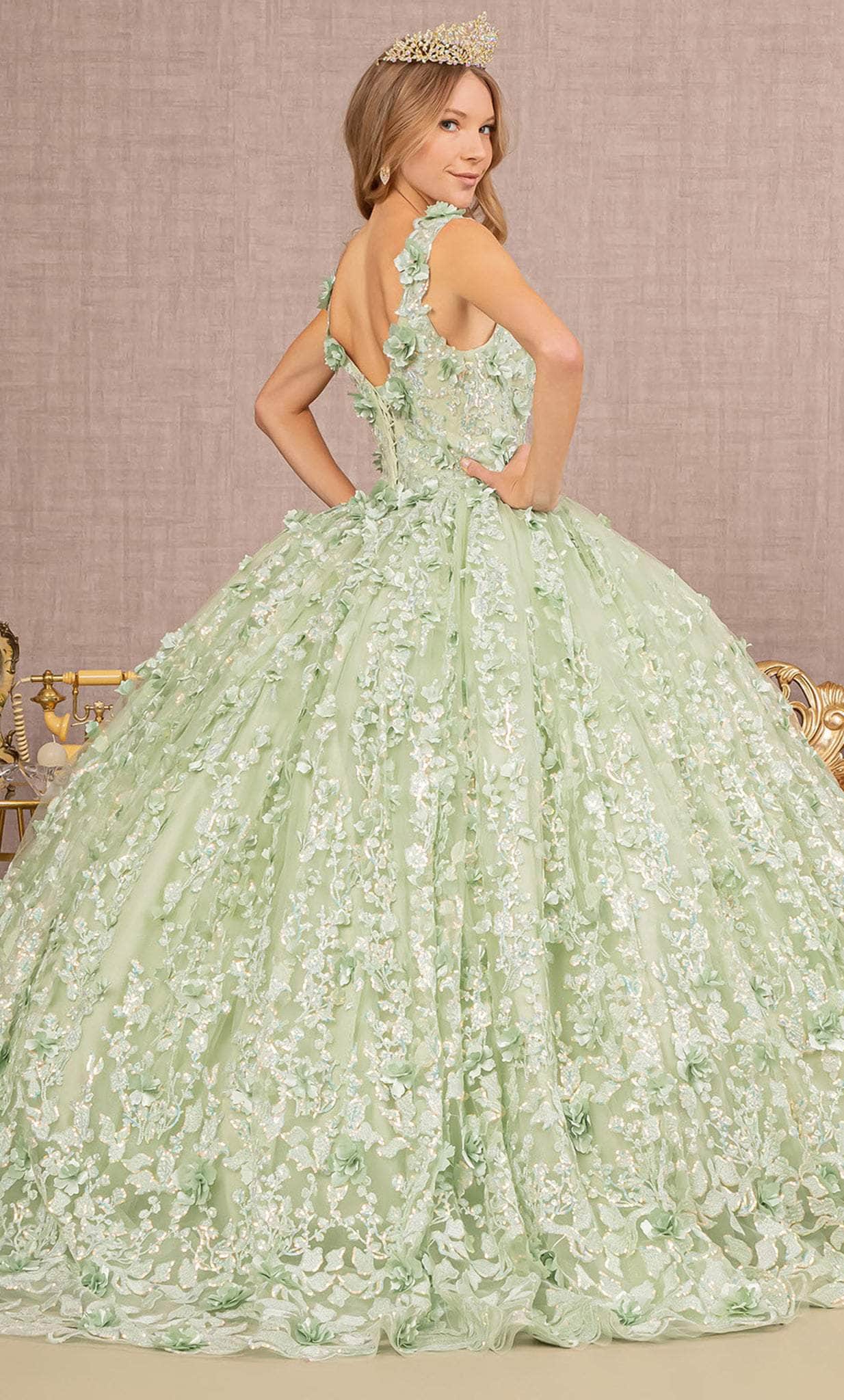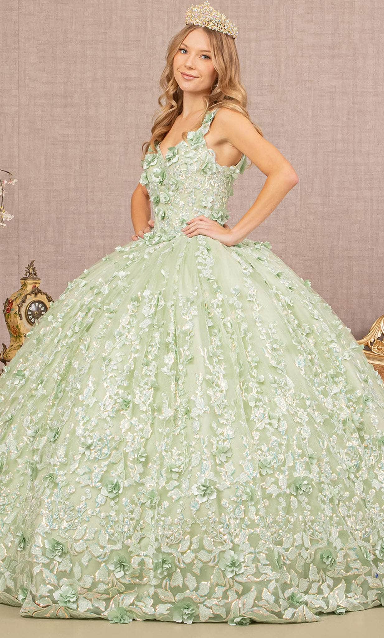 This enchanting Elizabeth K GL3173 is sure to make you the center of everyones attention. This gown that shimmers from front to back is carefully detailed with 3D floral appliques and sequins to add glow. Presented with sleeveless bodice and V neckline and a fitted torso. The silhouette is long that it reaches the floor and gives a volume with its ball gown shape. Closes with lace-up back tie. You will undoubtedly stand out on every occasion with Elizabeth K GL3173. Model is wearing Sage color.