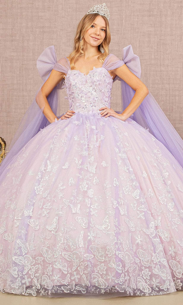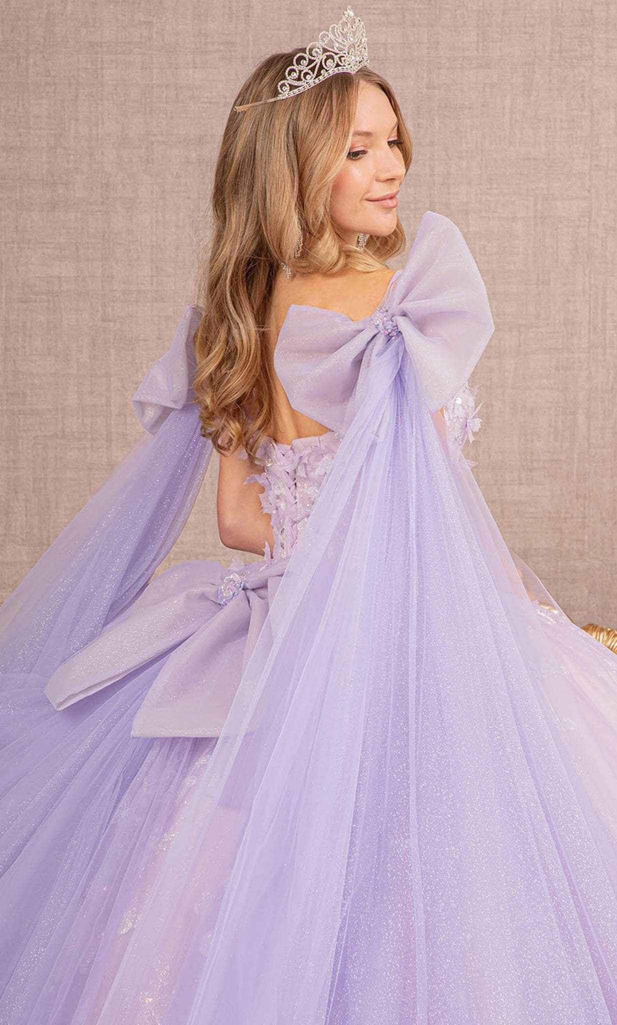 Be the spectacular belle on your next formal event in Elizabeth K GL3175. Features an extravagant shoulder sash with large ribbons on both sleeves made from a soft tulle fabric. The subtle embroidery details of butterflies makes this gown more graceful and elegant as it is. Silhouette is a voluminous ball gown that flows to the ground and walks with a sweep train. You are princess for an evening in this beautiful design from Elizabeth K GL3175. Model is wearing Lilac color.