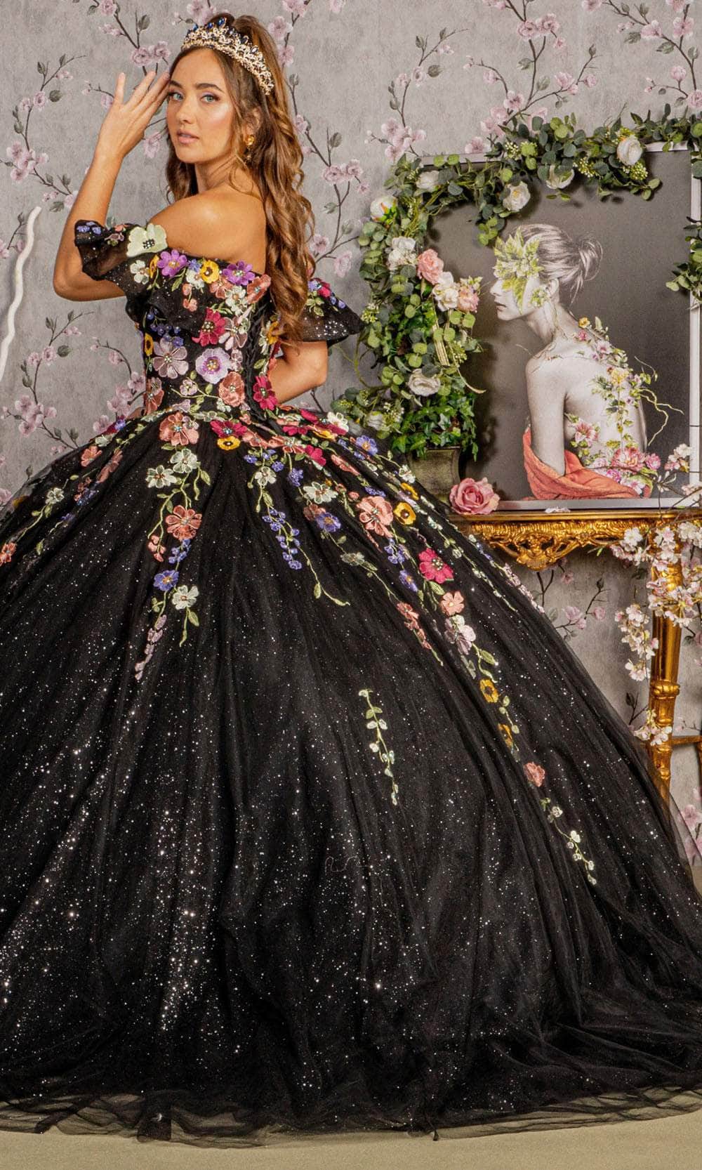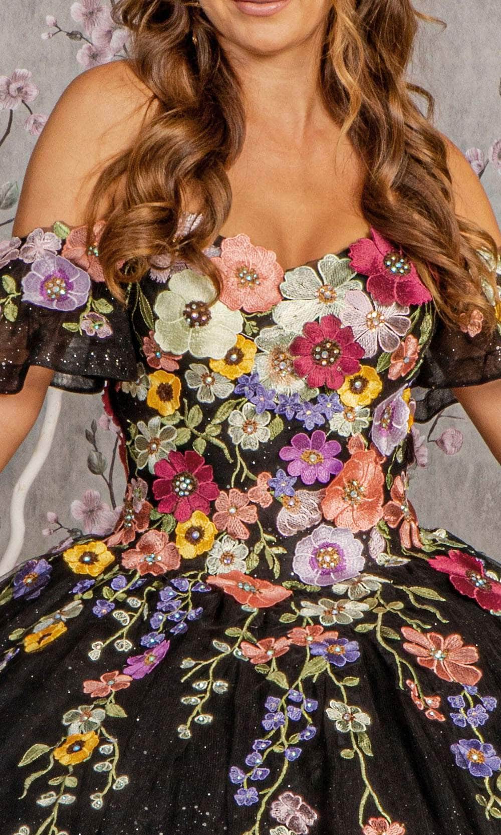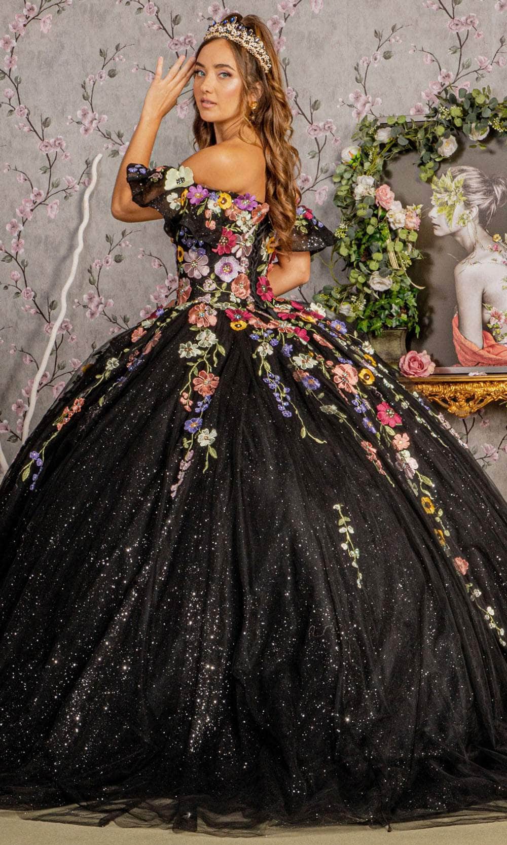 Seize the spotlight at your lavish event and become the standout figure at your prom in the enchanting Elizabeth K GL3177 ball gown. This gown features a sweet and charming sweetheart neckline on a fitted bodice, accompanied by delightful detachable flutter short sleeves. The mid-open back is gracefully secured by lace, adding a touch of sophistication. Additionally, this exceptional creation is skillfully crafted with a combination of floral appliques, glitters, and beads, allowing you to radiate beauty. Get ready for all eyes to be fixed on you as you captivate the crowd in this Elizabeth K GL3177 masterpiece. Model is wearing Black color.