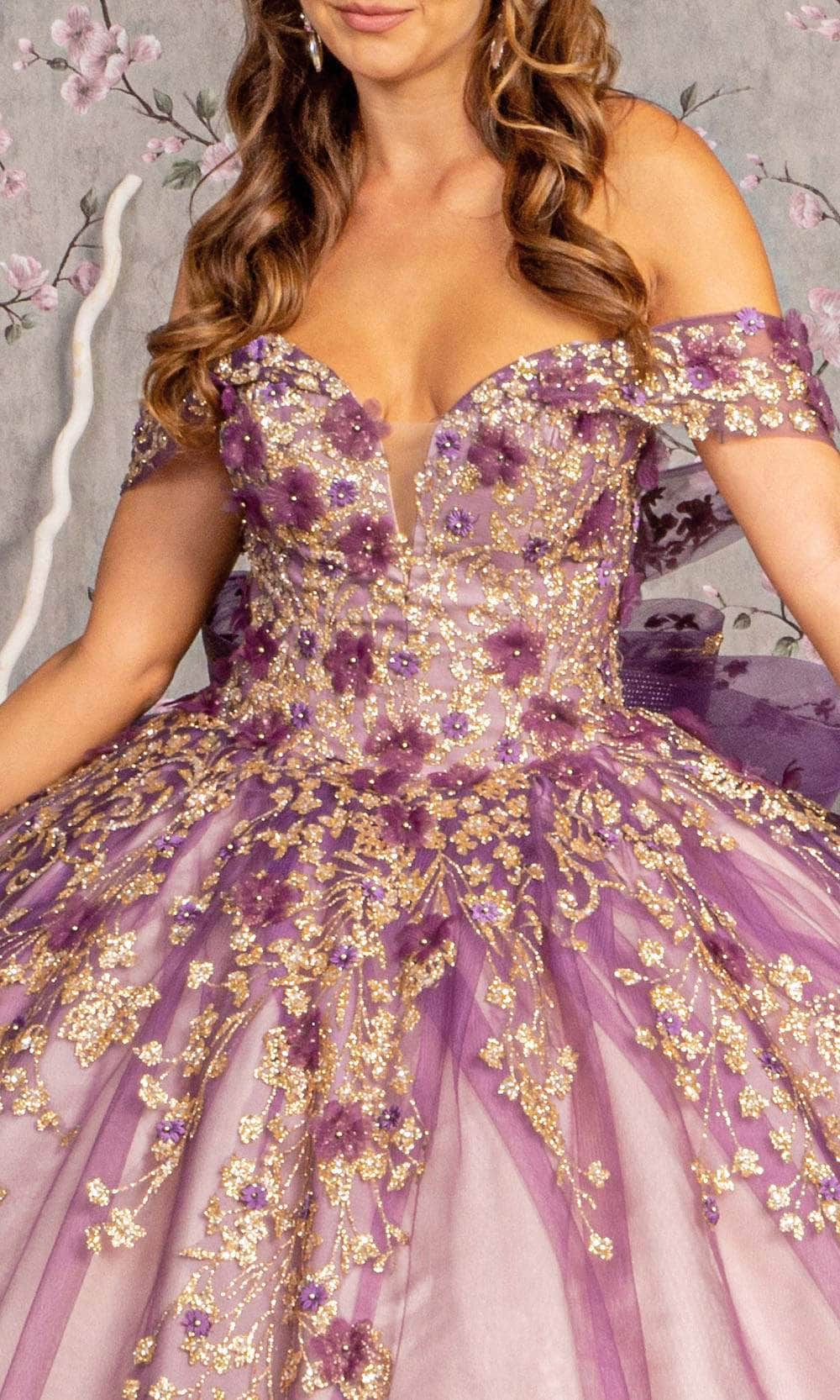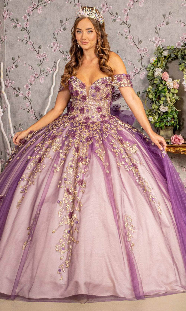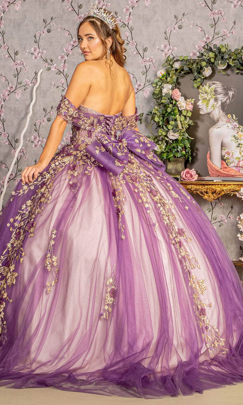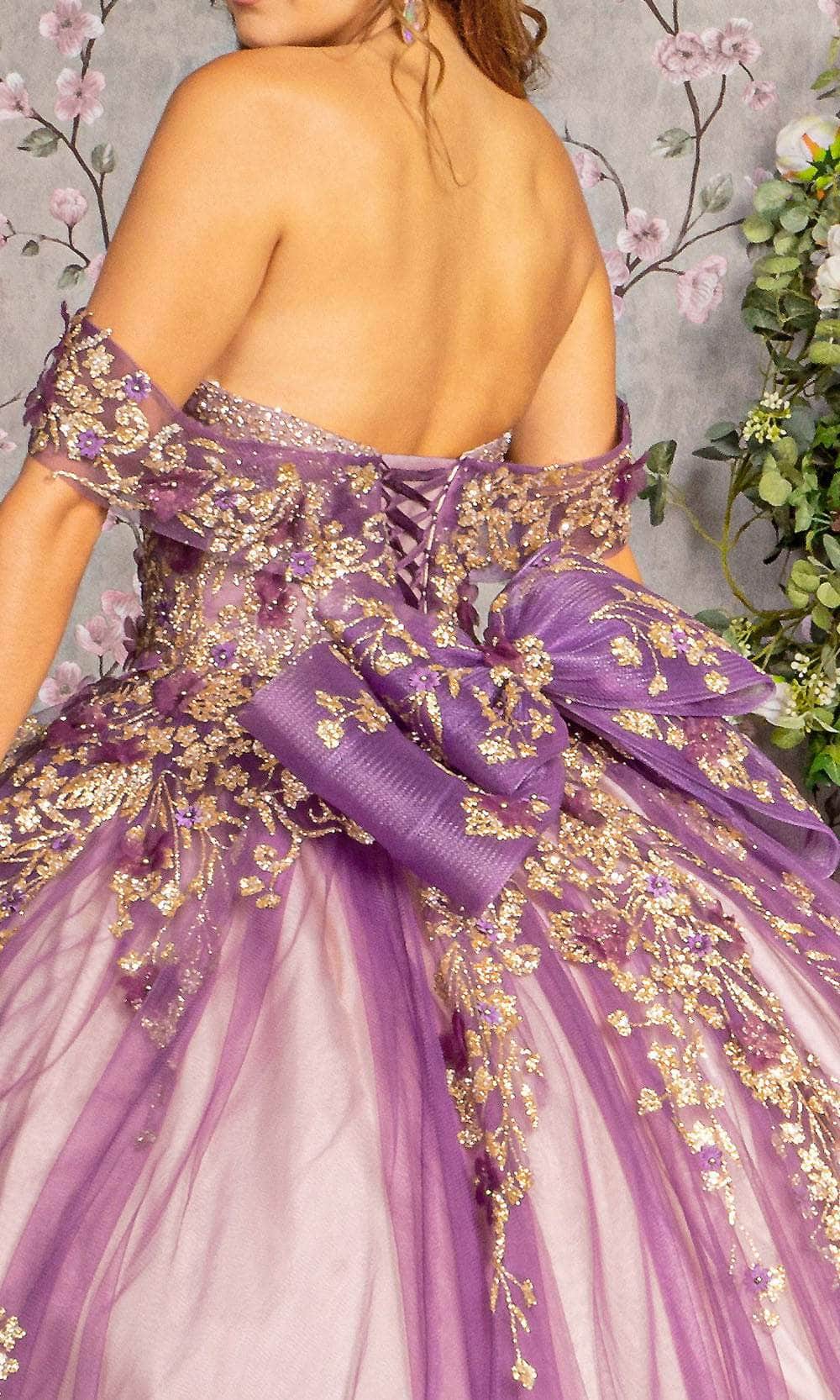 Exude absolute charm in the mesmerizing Elizabeth K GL3178 ball gown. This captivating dress features an enchanting off-shoulder neckline on a fitted bodice with a sheer inset. The mid-open back is gracefully secured by lace, adding a touch of elegance. Enhancing its overall appeal, the gown boasts a fabulous back bow. Crafted with a combination of floral appliques, glitters, and beads, this dress ensures you look dazzling and lovely. Embrace the role of being the epitome of royal beauty in this Elizabeth K GL3178 masterpiece and make a lasting impression. Model is wearing Purple/Nude color.