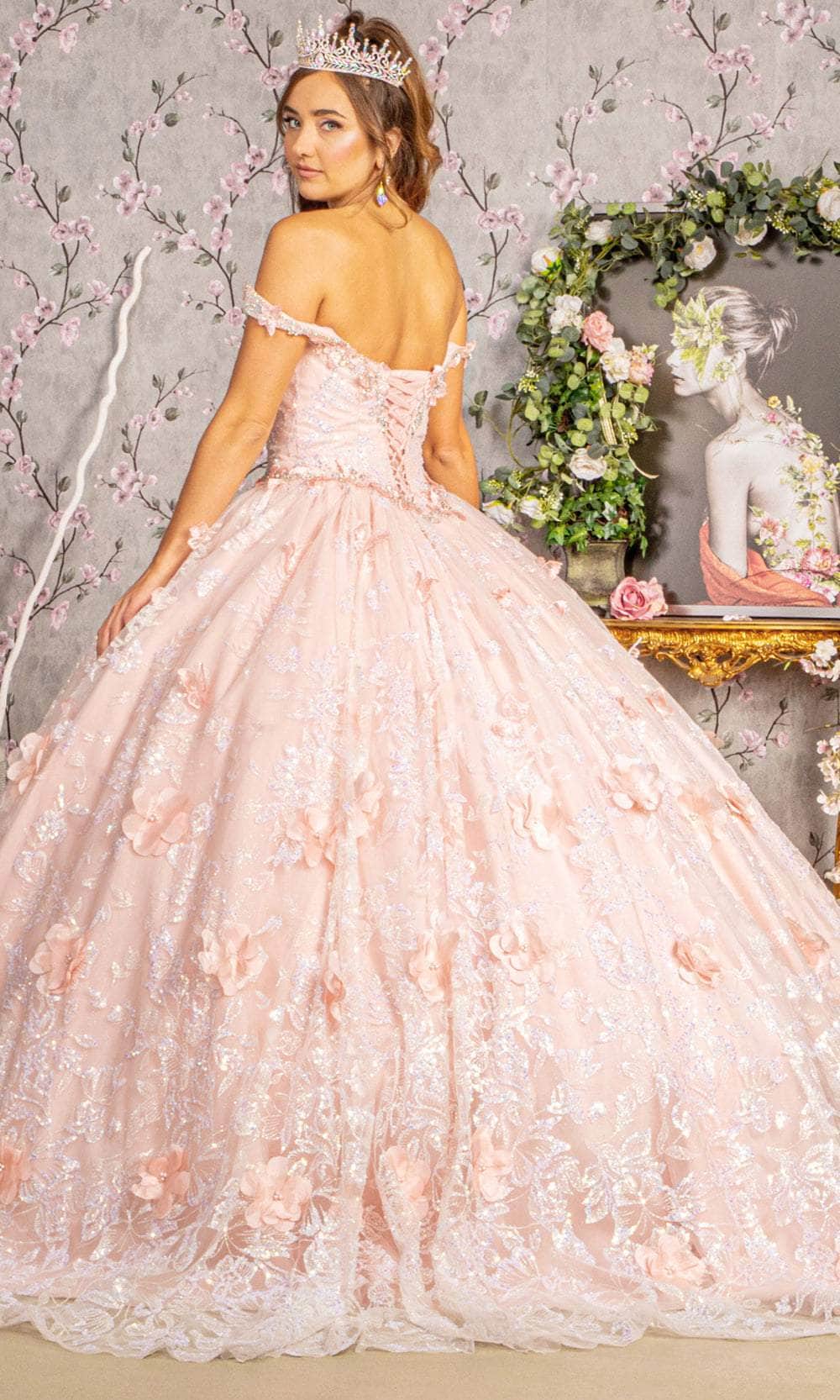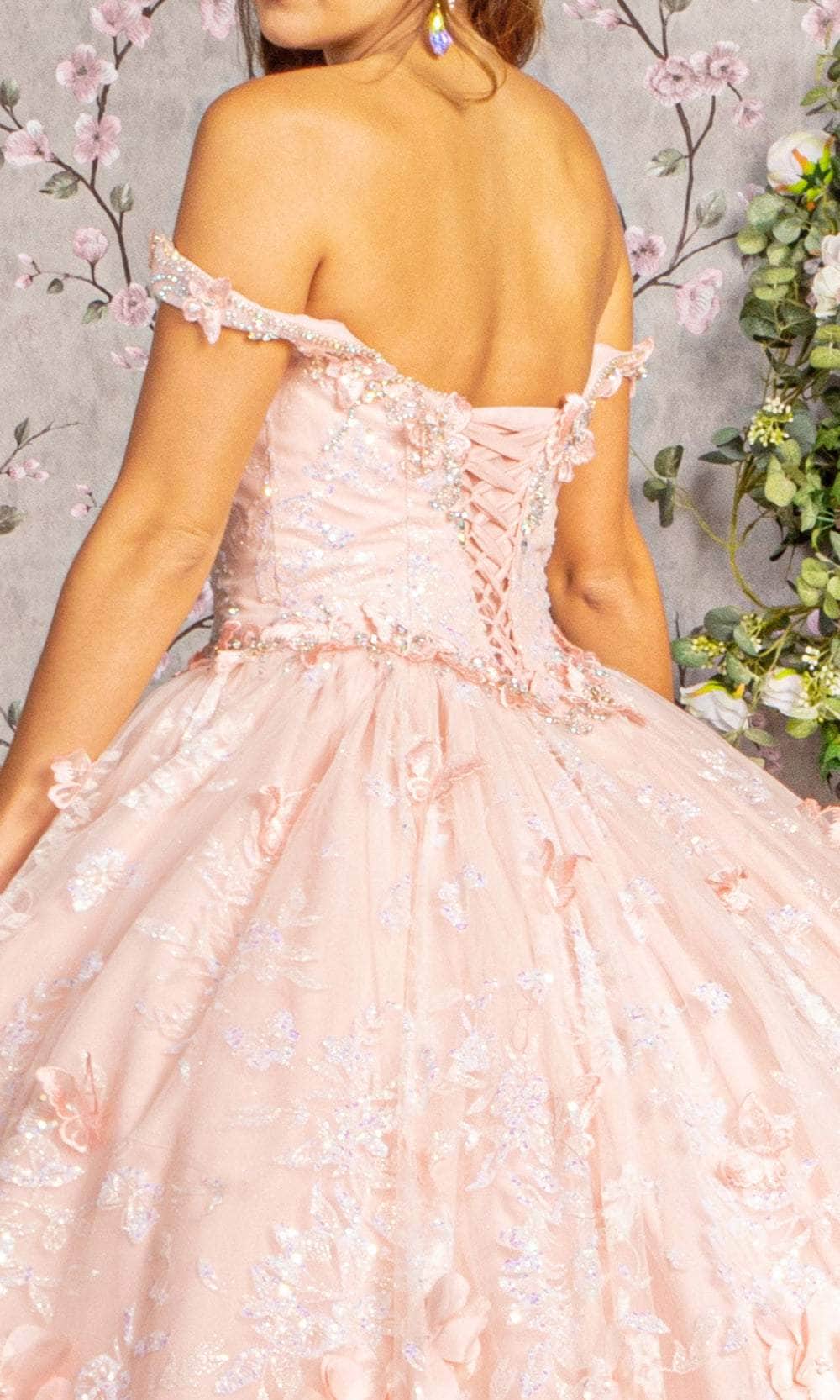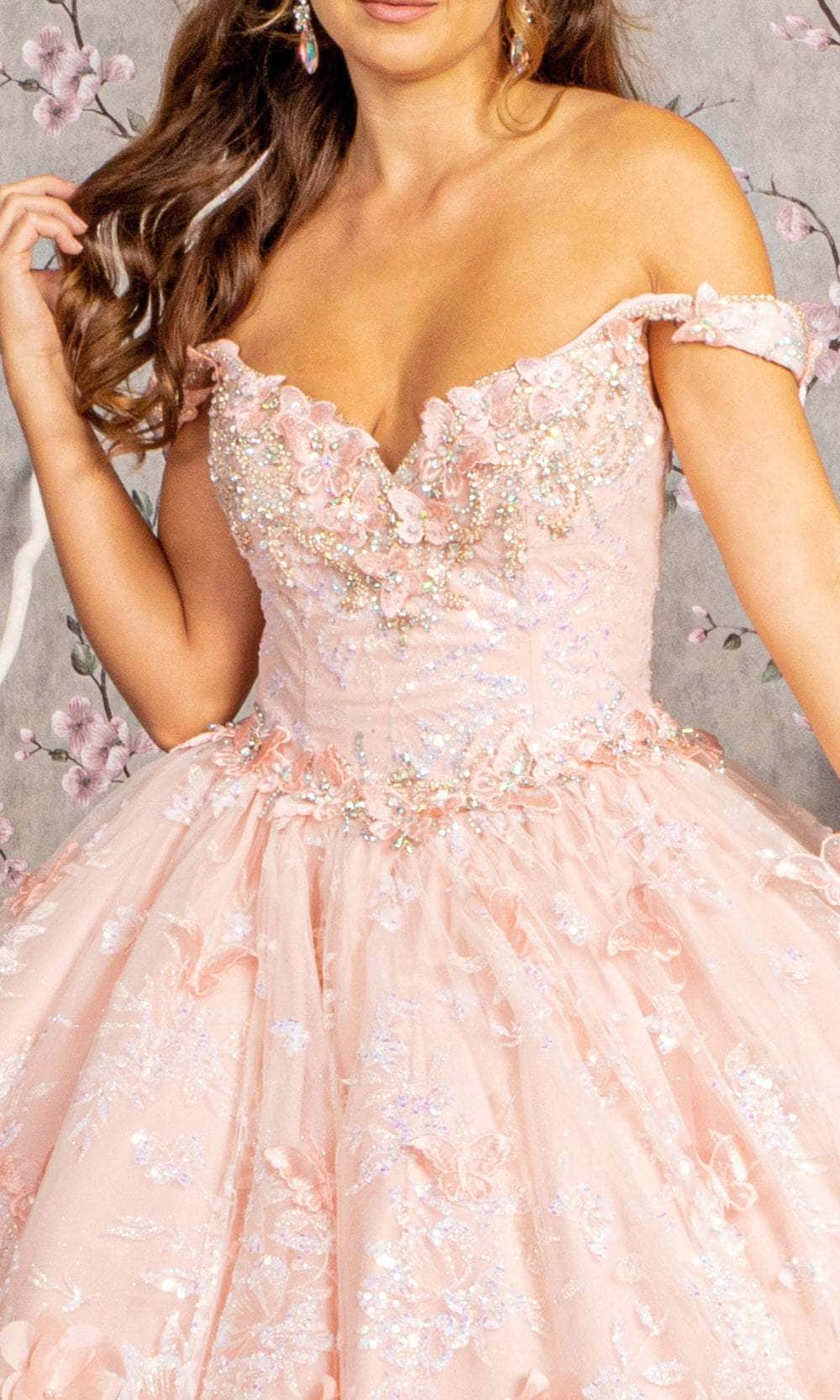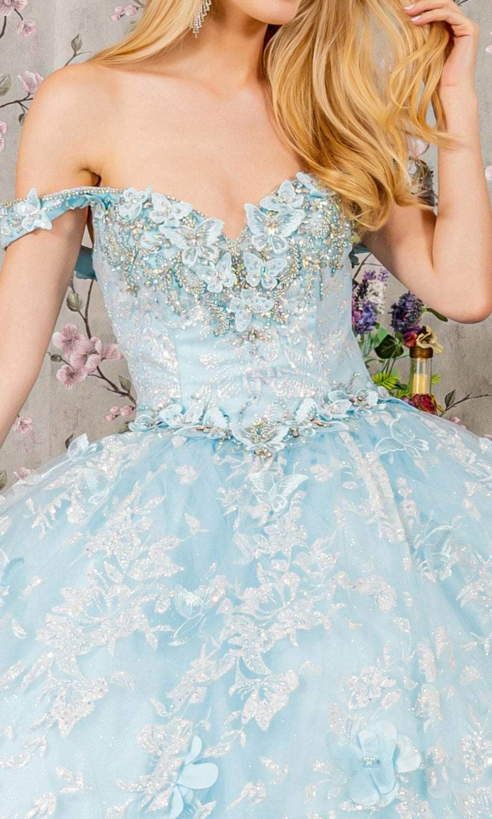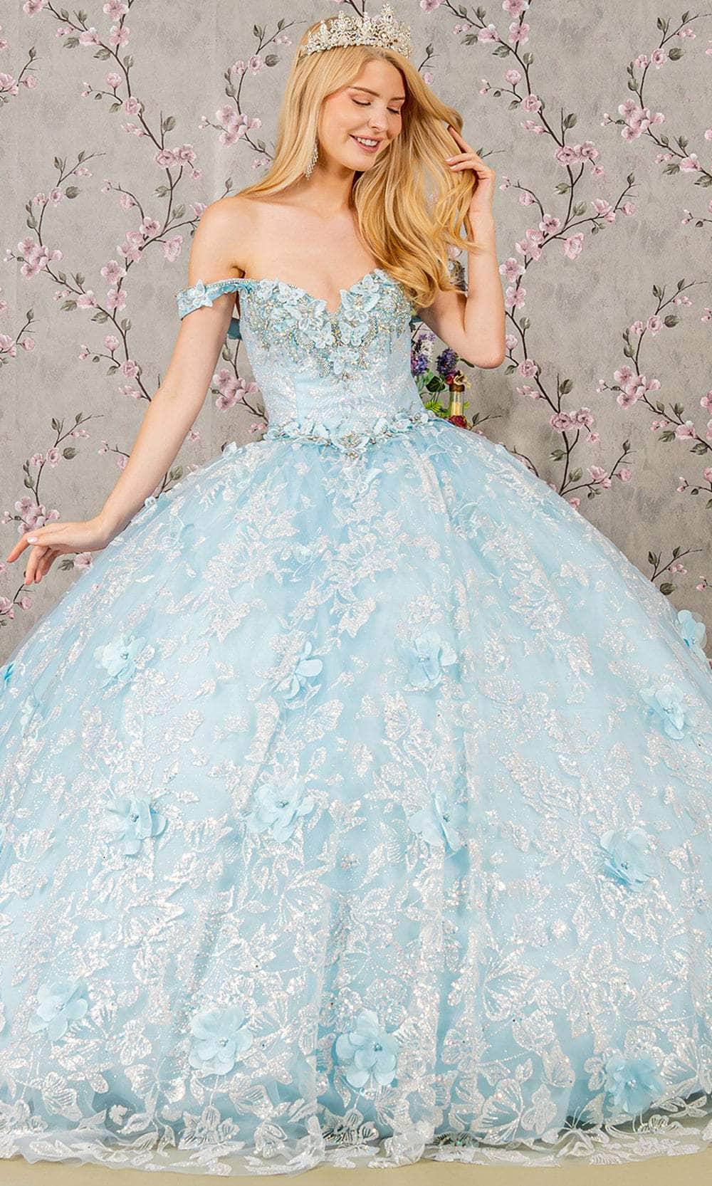 Craft a memorable moment in this Elizabeth K GL3183 ball gown, dripping with impeccable charm! The dress showcases a delightful off-shoulder neckline on a well-fitted bodice, complemented by a classy basque waistline. The mid-open back is elegantly secured by a lace closure for a graceful finish. This floor-length creation is meticulously crafted with beads, floral appliques, sequins, and glitters, ensuring you look utterly fetching. The Elizabeth K GL3183 masterpiece is truly a definition of glamour, making it a stand-out choice for any special occasion. Models are wearing Baby Blue, and Blush colors.