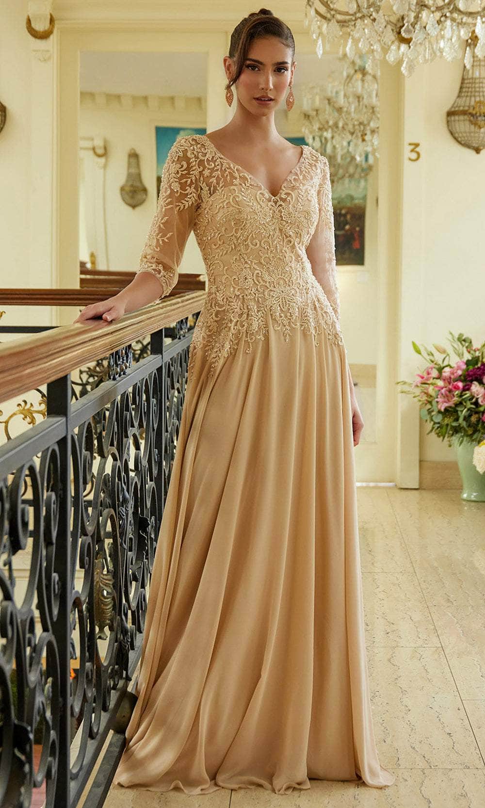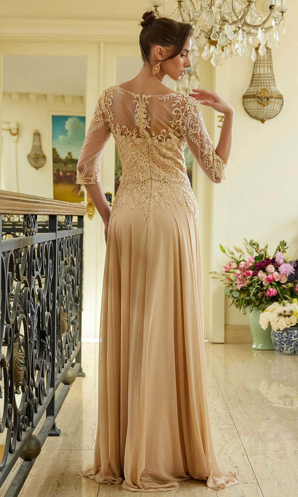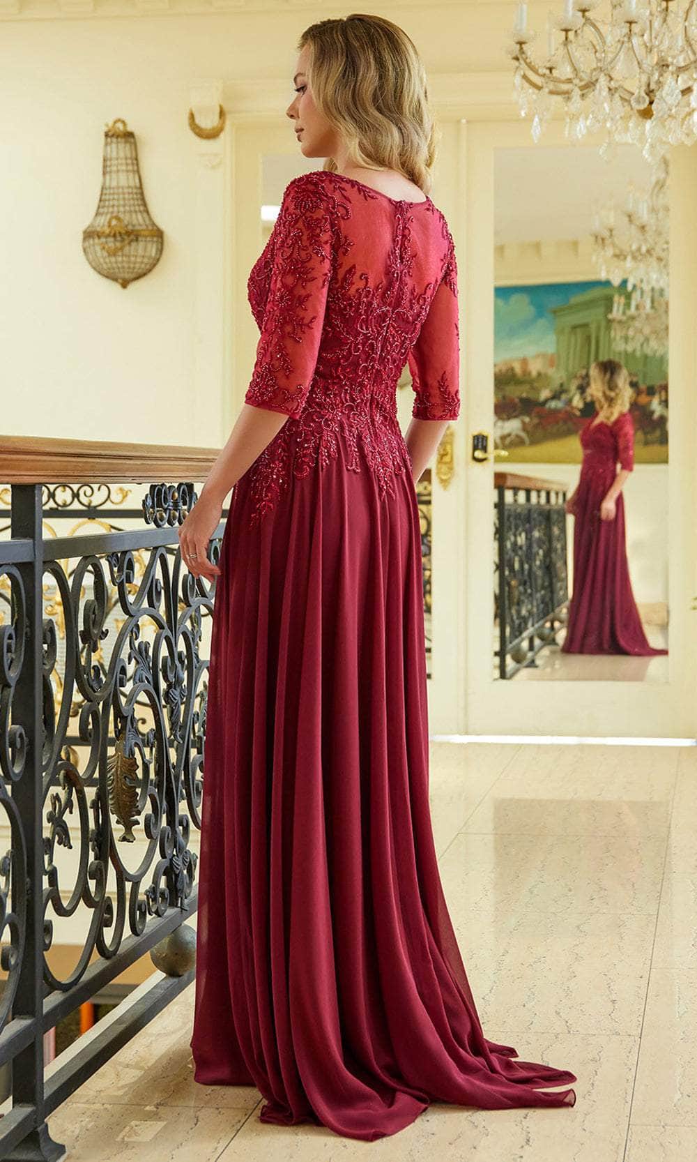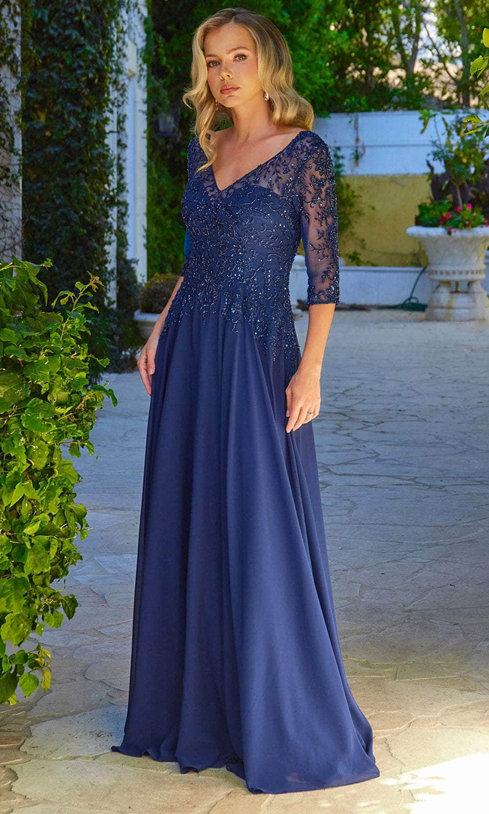 Impress the crowd in this Elizabeth K GL3573 creation and unveil your innate beauty. The top bodice of this eye-catching gown is decorated with shimmering sequins, beadworks, and artful embroidery. A sweetheart lining enhances the illusion V-neckline with a touch of romance, and the sheer quarter-length sleeves wonderfully cover your arms. At the back, it highlights the partial illusion details and concealed zipper closure. The chiffon skirt forms a flowy A-line silhouette with pleats design for added fashionable statement and sweeping train in the end. This Elizabeth K GL3573 long dress is suitable for any occasion, especially for the mother of the bride or groom. Models are wearing Burgundy, Champagne, and Navy colors.