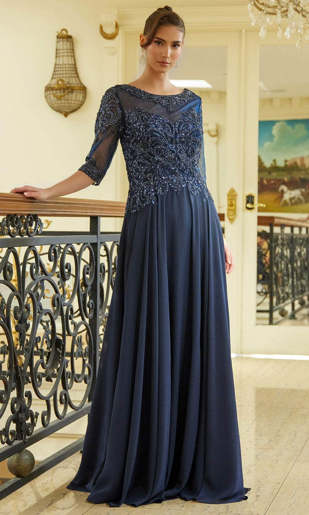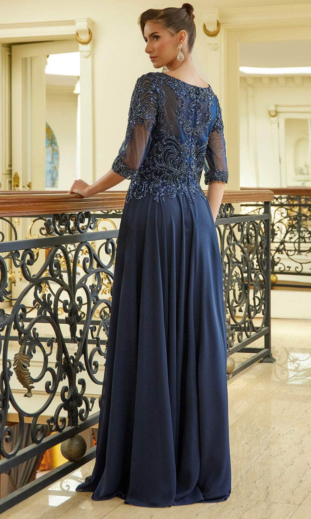 Wrap yourself in an utterly elegant style in this Elizabeth K GL3599 formal dress. Beads, sequins, and lace appliques beautified the top bodice of this dress for a twinkling and show-stopping appearance. Other highlight features are the illusion detailing in the scoop neckline, quarter-length sleeves and full back. The sweetheart lining adds a hit of allure. Soft pleating in the chiffon A-line skirt creates a beautiful movement as it glides down to the full-length hemline. The Elizabeth K GL3599 mother of the bride or groom dress promises all eyes will be on you as you make an entrance to the hall. Models are wearing Champagne, Navy, and Olive colors.