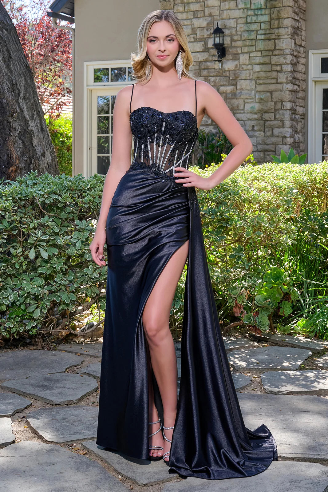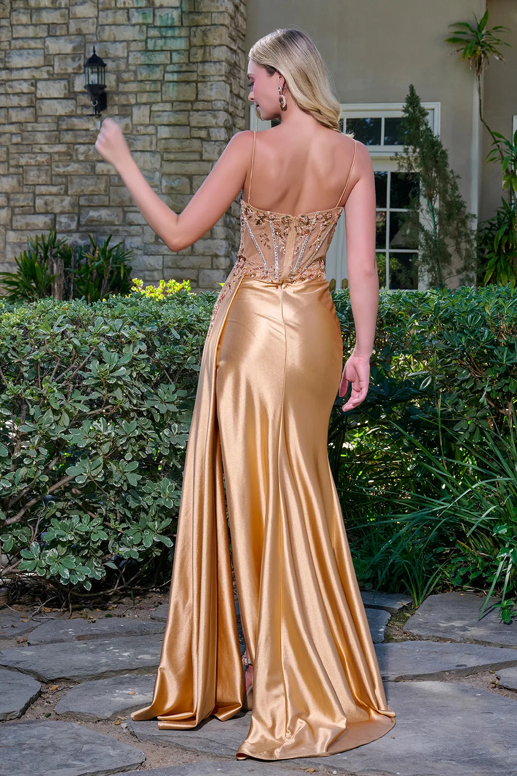 | Details: | Sleeveless, Sheer Corset Bodice, Thin Straps, Back Zipper Closure, Side Sash, Slit, Train |