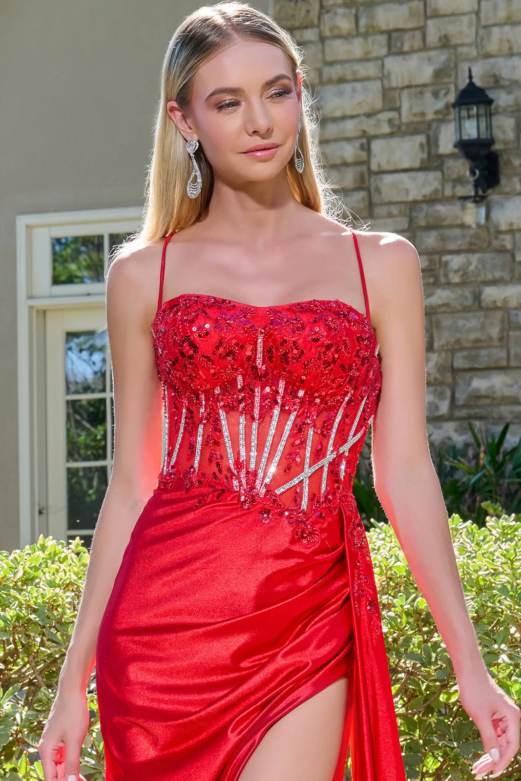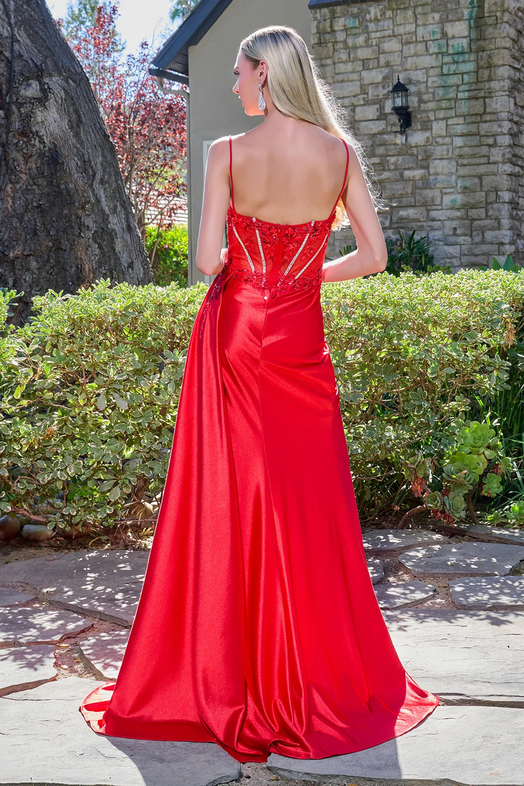 Fascinate everyone in this GLS by Gloria GL3619 dress, an exquisite floor-length gown tailored to perfection. This stunning sleeveless dress features a sweetheart neckline and delicate spaghetti straps, creating a romantic and elegant silhouette. The bejeweled mesh corset bodice adds a touch of sparkle and luxury, while the ruched satin skirt with a high slit provides a chic and dramatic effect. The skirt parades in a sheath silhouette and ends with a train, enhanced by trailing fabric that adds a touch of sophistication. Stand out from the crowd with this GLS by Gloria GL3619.