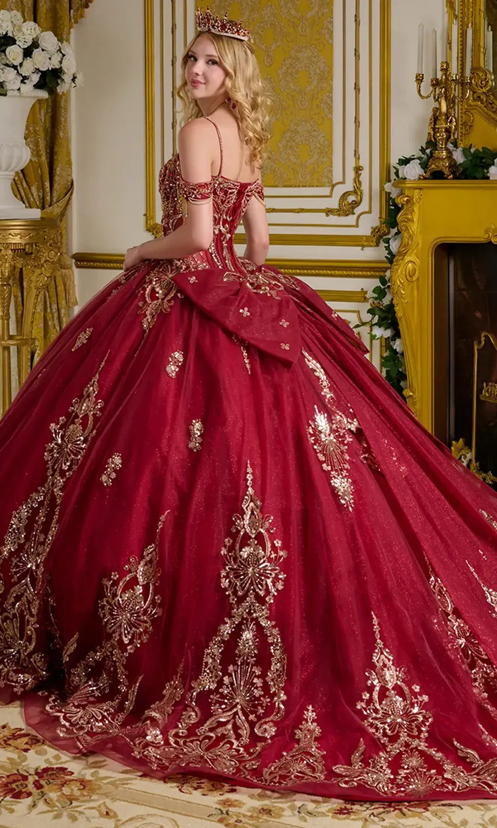 Glowing with regal detail, the Elizabeth K GL3639 captures the essence of a grand celebration. The off shoulder sleeves and sweetheart neckline frames the shoulders beautifully, while the sheer corset bodice features dazzling metallic embroidery, sequin and beadwork that flows seamlessly into the skirt. The Basque waistline enhances the silhouette for a flattering fit that feels timeless. With its exquisite oversized back bow and dramatic ballgown skirt, the Elizabeth K GL3639 is a gown meant to highlight unforgettable moments with unmatched beauty. Model is wearing Burgundy color.
