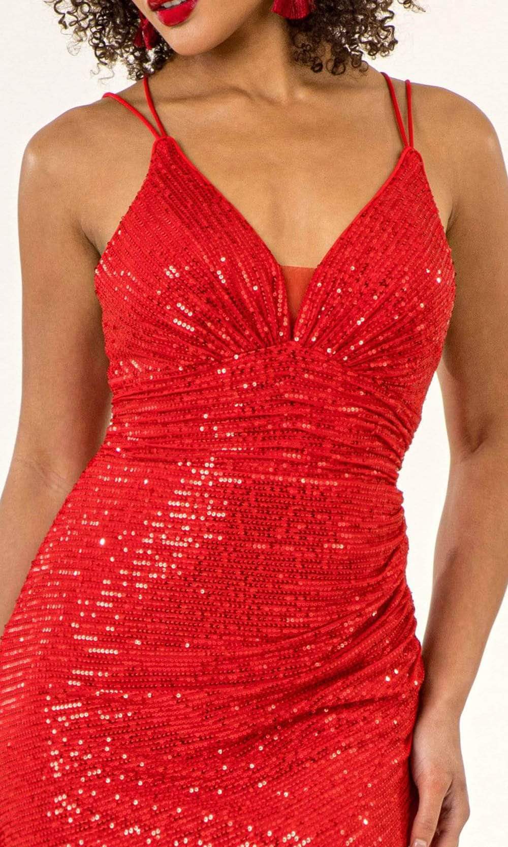 Give everyone a chance to admire your irresistible style in this gorgeous Elizabeth K GS1910 cocktail dress. Stunningly draped in shimmering sequins, this lovely piece features a plunged V-neckline with sheer mesh inset, ruched fitted bodice and a sheath skirt that finishes in an alluring short hem. Be the iridescent beauty everybody is mooning over in this chic Elizabeth K embellished bodycon dress.