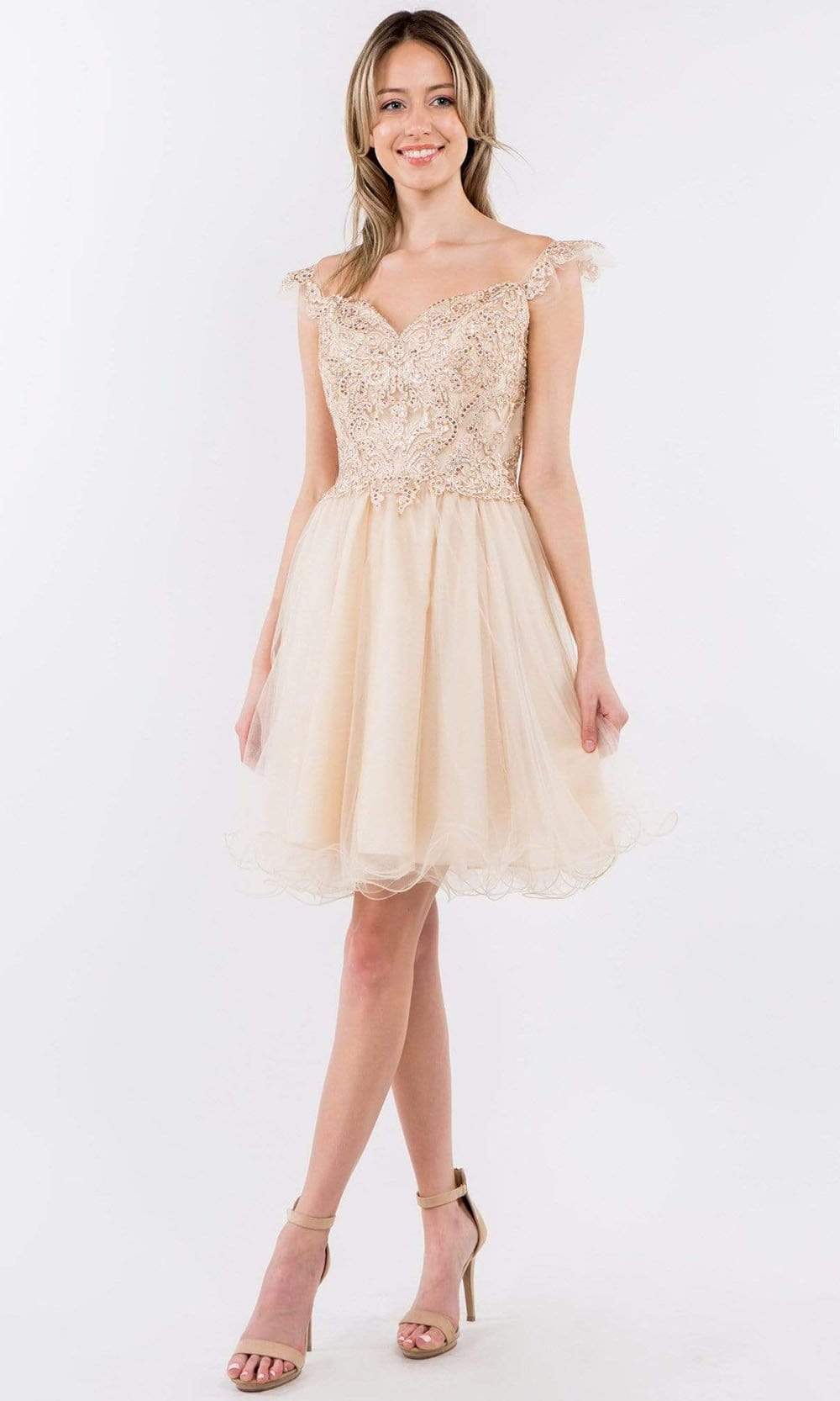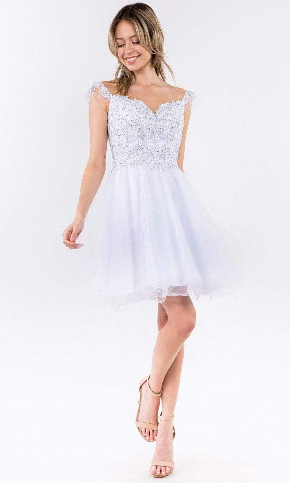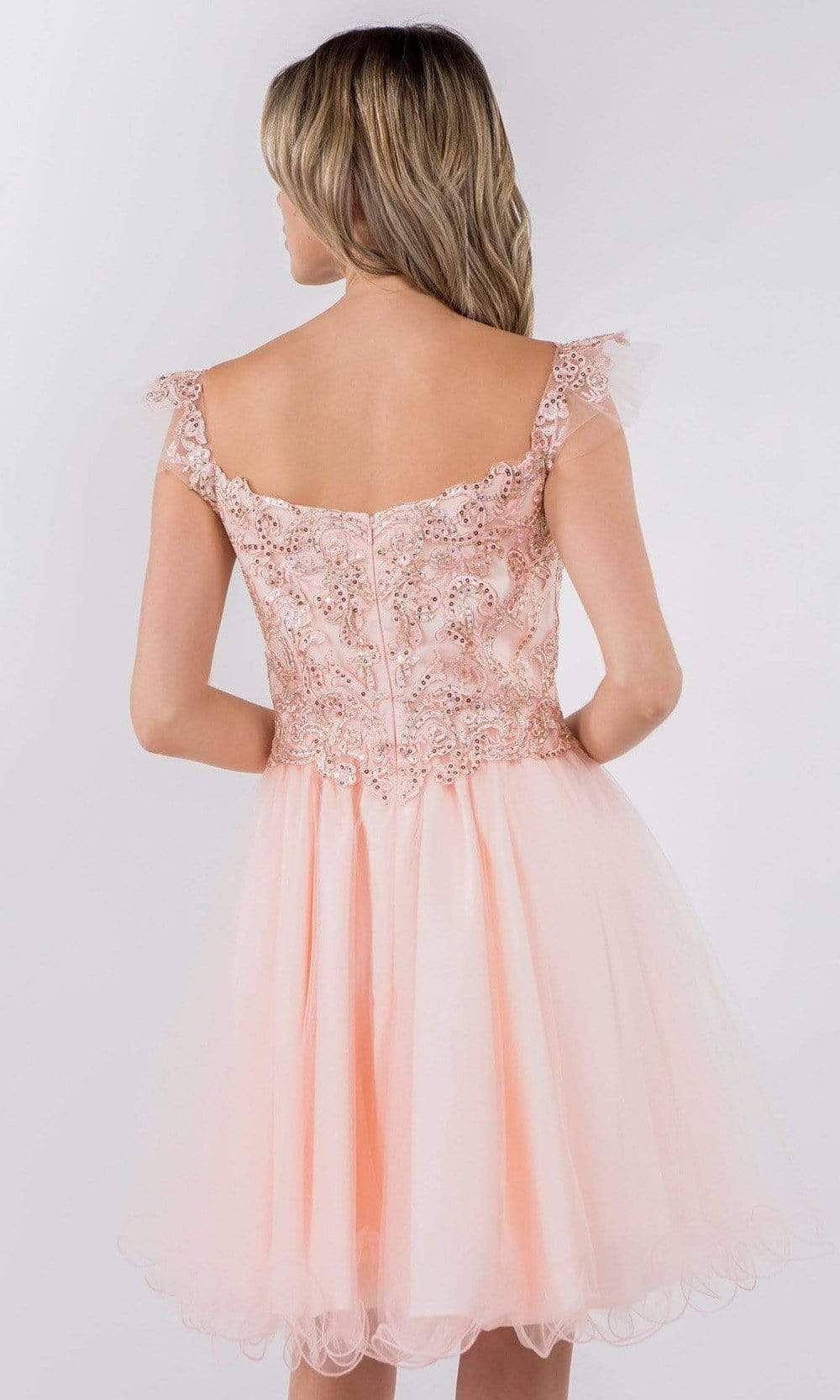 Look delectably feminine in this stunning Elizabeth K GS1966 creation. Accented with embroidered appliques and jewels, this stunner shows a sweetheart neckline and draped with flutter straps. The back is designed with a zipper closure and a square cut back. The A-line skirt flares into an ethereal short hemline. Bound to steal the spotlight in this Elizabeth K masterpiece.