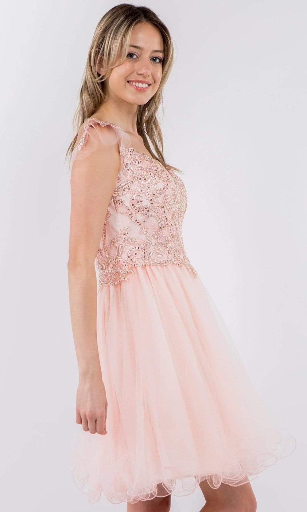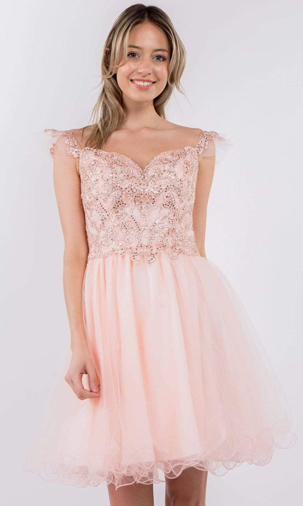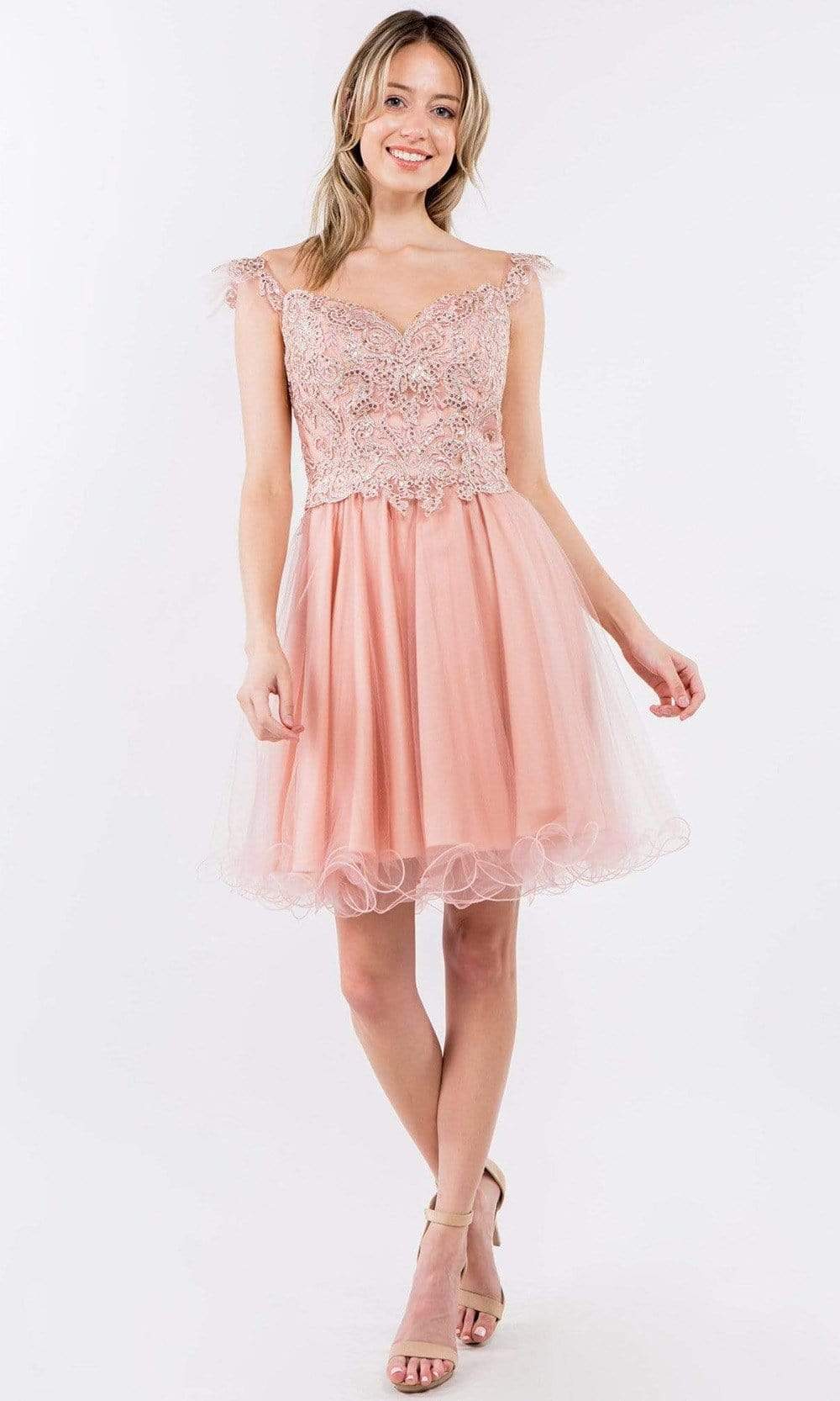 Look delectably feminine in this stunning Elizabeth K GS1966 creation. Accented with embroidered appliques and jewels, this stunner shows a sweetheart neckline and draped with flutter straps. The back is designed with a zipper closure and a square cut back. The A-line skirt flares into an ethereal short hemline. Bound to steal the spotlight in this Elizabeth K masterpiece.