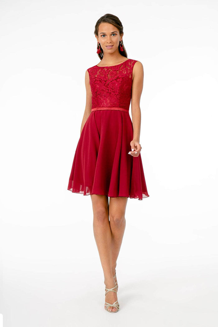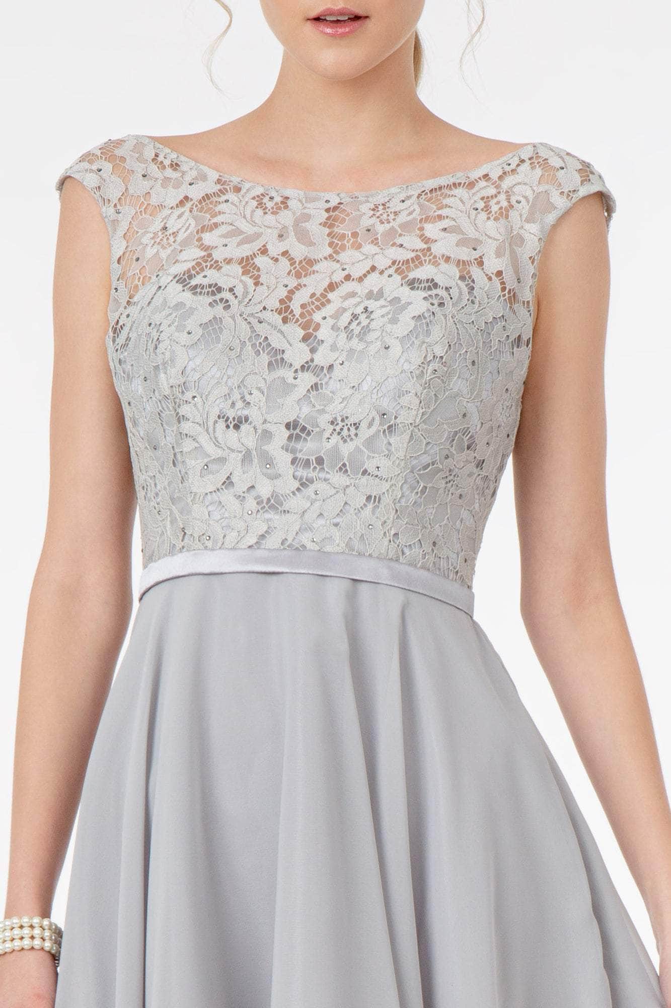 Glide into the room and simply be breathtaking in this Elizabeth K GS2807 creation. Draped with rhinestone ornate lace bodice, this dress charms with a bateau neckline paired with a corset lace up back. Nipped with a satin waistband, the fluttering chiffon skirt flows into a short hemline. Be at the front and center of the flashing cameras in this Elizabeth K masterpiece. Model is wearing the Baby Blue color.