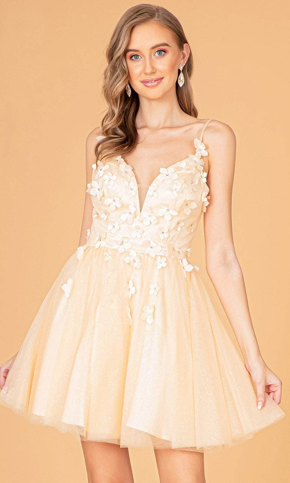 Every girl deserves to have a memorable prom and this eye catching Elizabeth K GS3090 cocktail dress. This dress features a sleeveless bodice, a plunging sweetheart neckline with mesh inset for modesty, as well as a sheer corset lace-up back as the bodice is embellished with beaded and floral appliques. The A line sparkle tulle skirt flares to a mid thigh length hemline to complete your look. Be the queen of the night when you wear this Elizabeth K GS3090. Models are wearing Burgundy, Champagne, Royal Blue, and Smoky Blue colors.