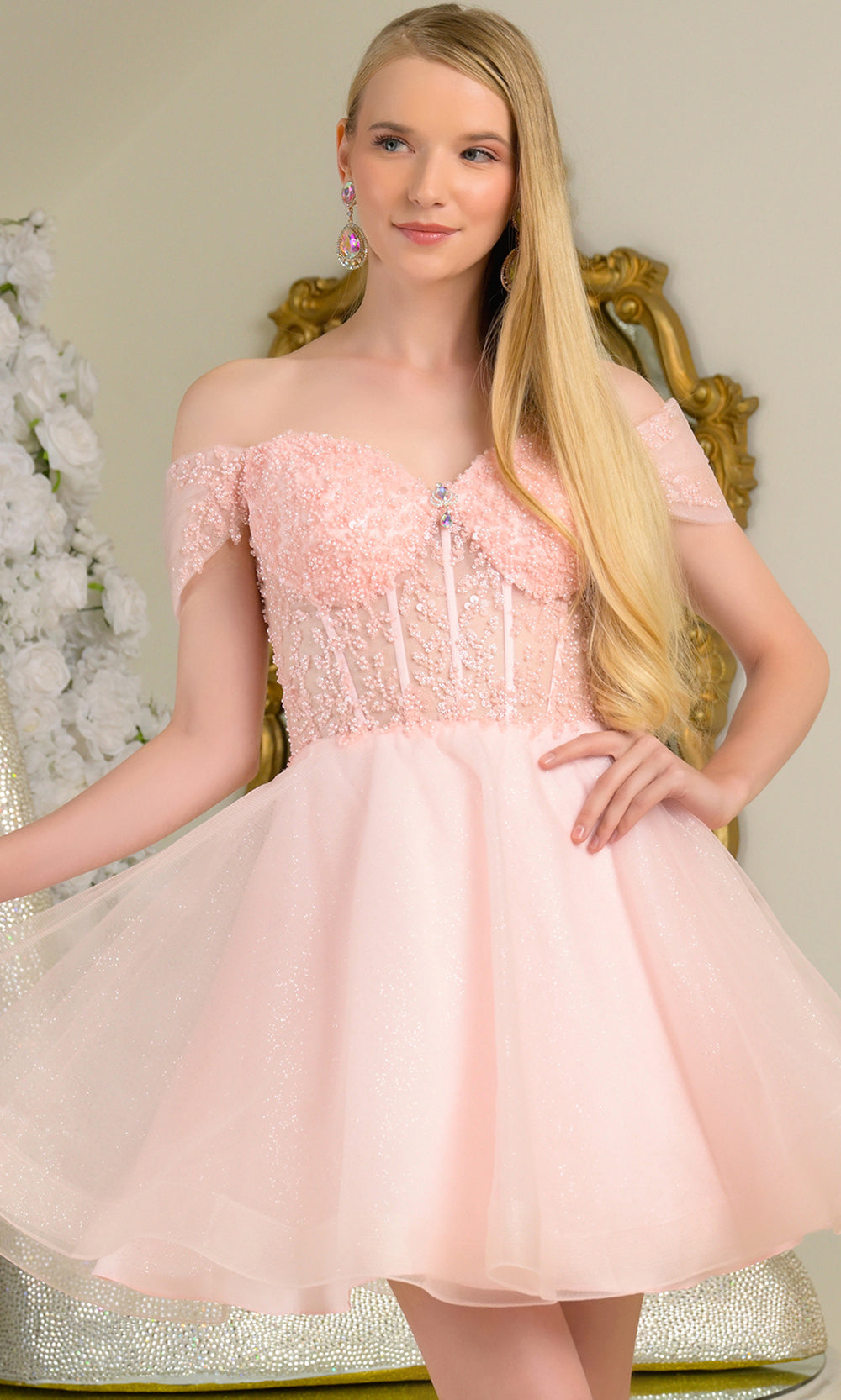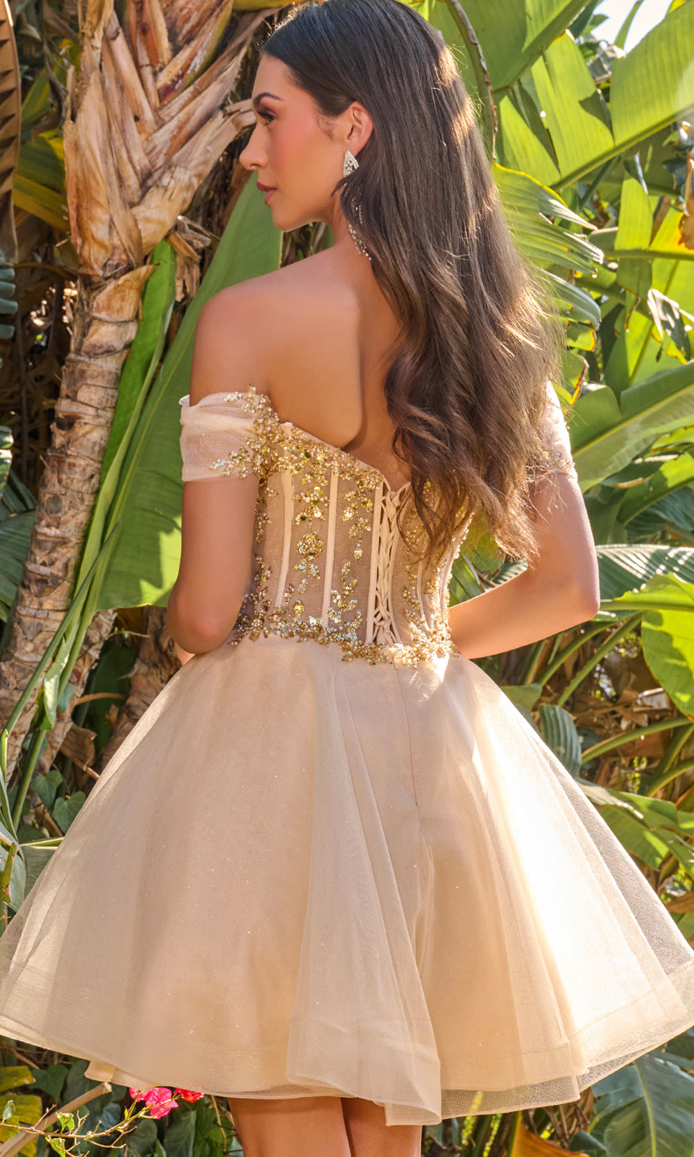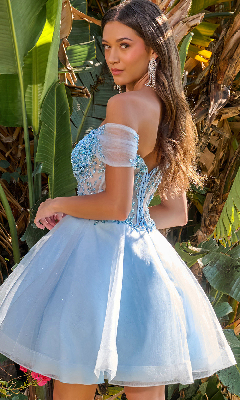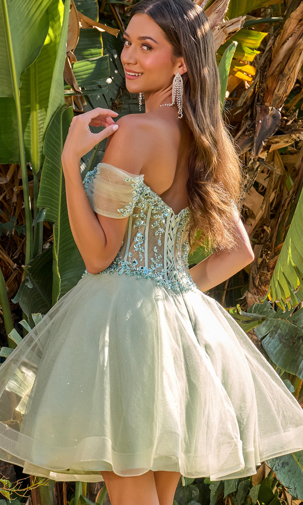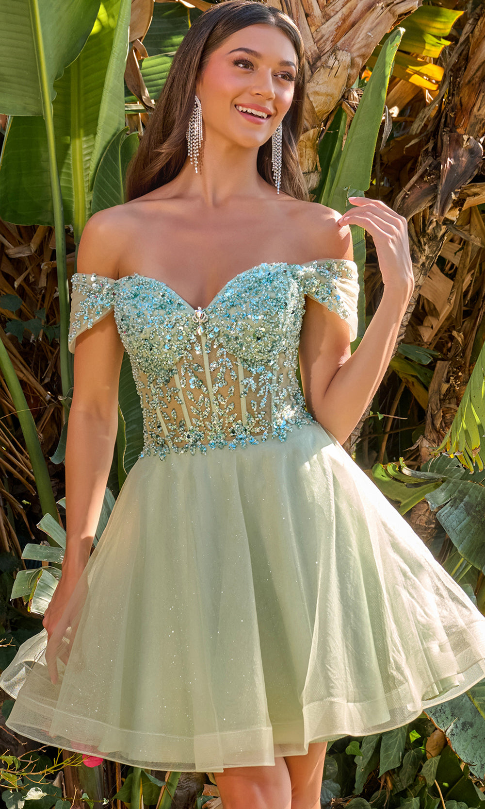 Pure enchantment radiates through the romantic artistry of Elizabeth K GS3684, a captivating short dress that exudes charm and youthful elegance. The illusion corset bodice shimmers with exquisite beading and sequin embellishments, beautifully complementing the off-shoulder sweetheart neckline. A lace-up back enhances the feminine silhouette, while the layered A-line skirt brings a touch of movement and volume. Elizabeth K GS3684 is a radiant choice for any special celebration where poise and grace take center stage. Models are wearing Blue, Blush, Champagne, Lilac, Sage, and White colors.